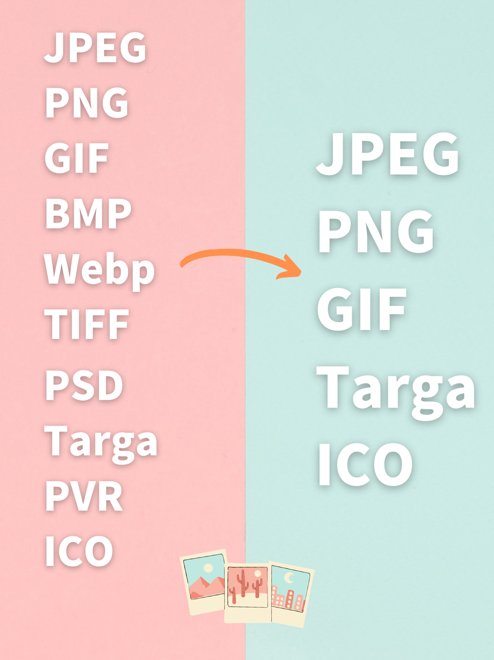 JPEG, PNG, GIF, BMP, Webp, TIFF, PSD, Targa, PVR, ICO
