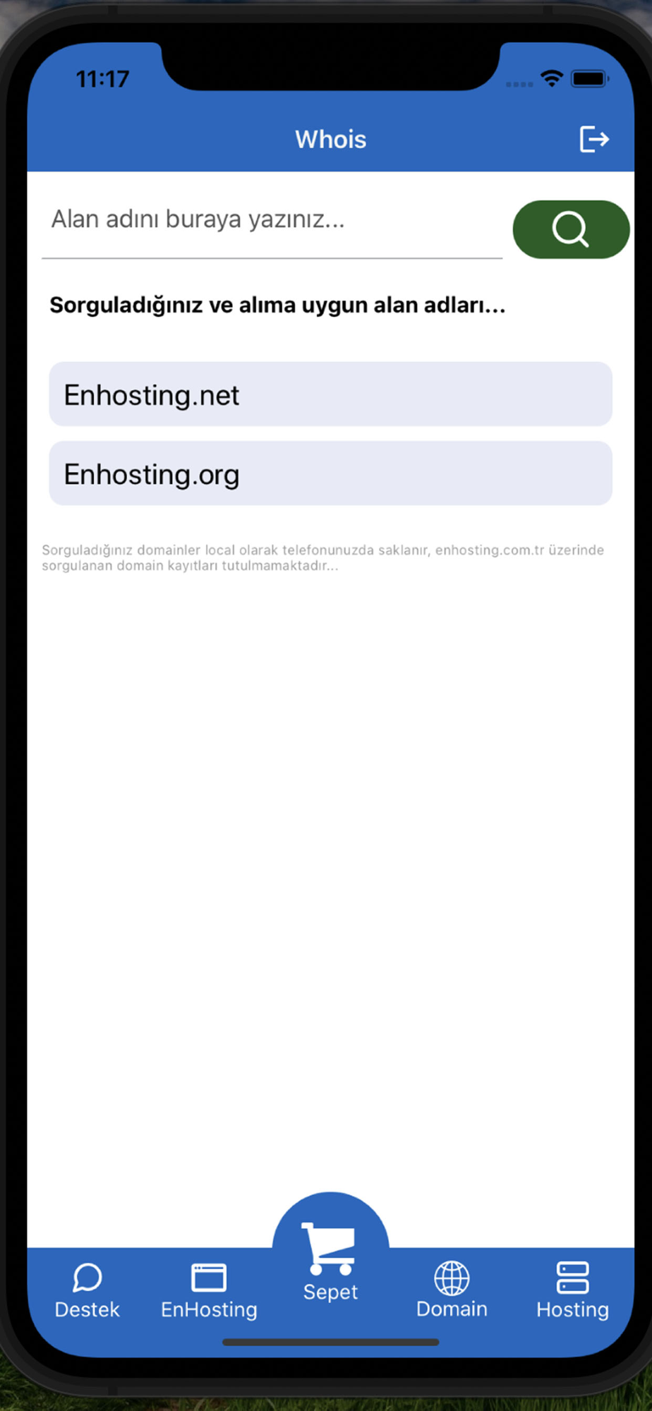 Enhosting için domain sorgulama , satın alma veya hizmetlerinizi ve domain adreslerinizi görüntüleyebileceğiniz ve destek alabileceğiniz mobil uygulama