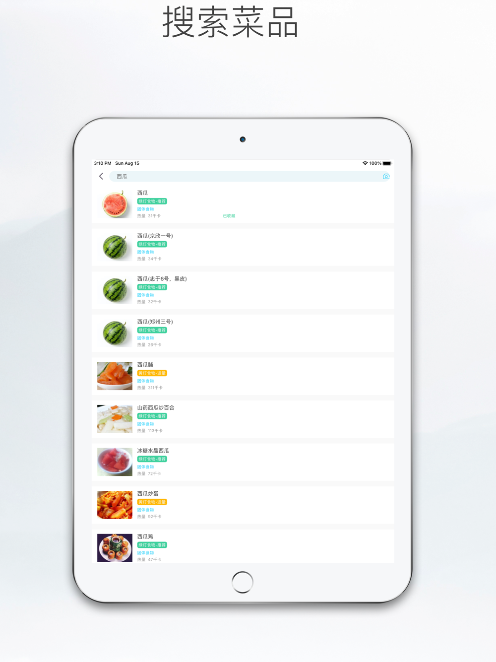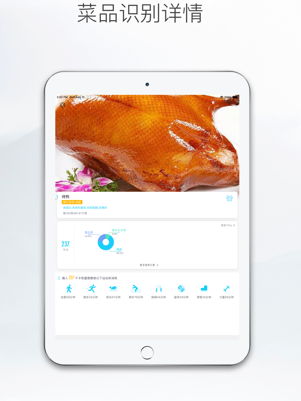 2、准确识别出菜品名称,热量,自动分析菜品各种营养元素含量。