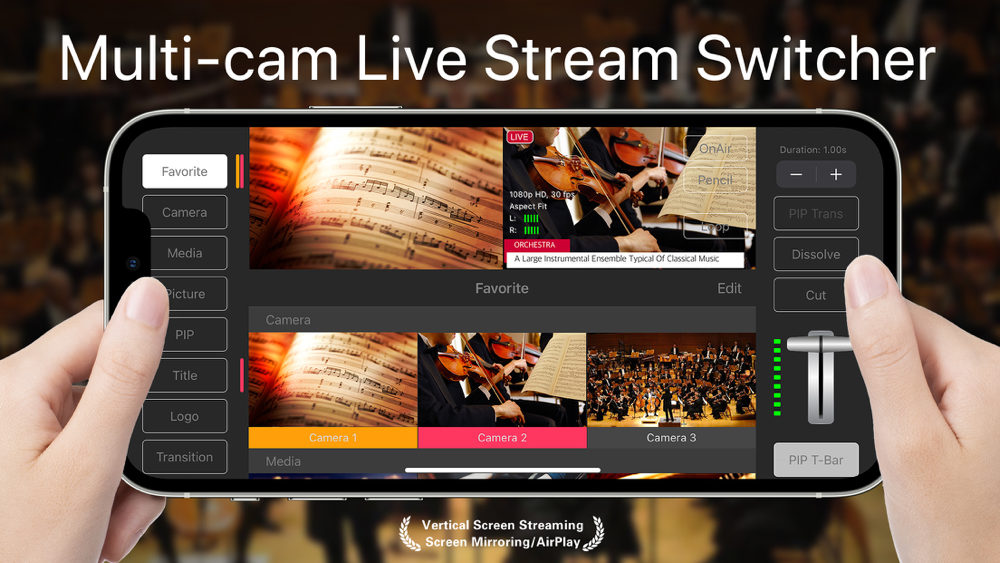 - Real-time transition among the external inputs, built-in cameras, and media in the Photo Library
