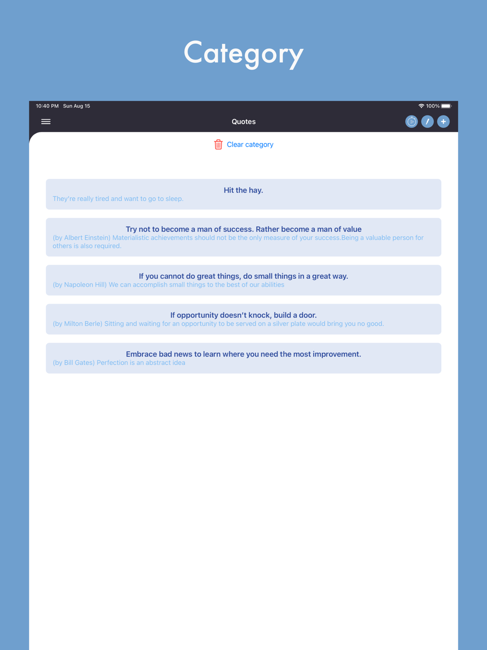 Add all your records as abbreviations, new words, idioms, technical words or quotes and organise them in different categories. A plus which this app brings is the fact that all records are synced across all devices which are using the same iCloud account.