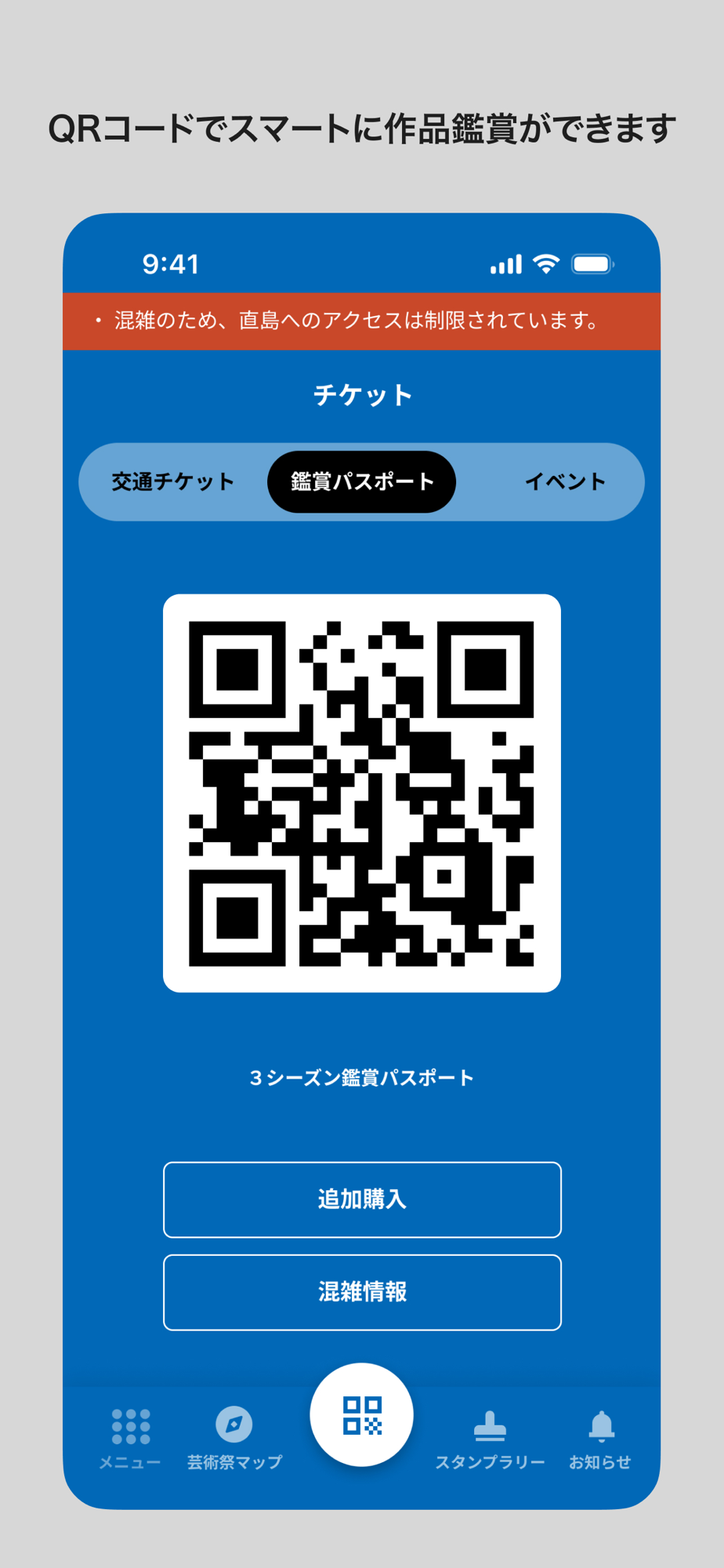 アプリでは、作品鑑賞パスポートやバス・フェリーなどの交通チケット、会期中のイベントチケットを購入いただけます。