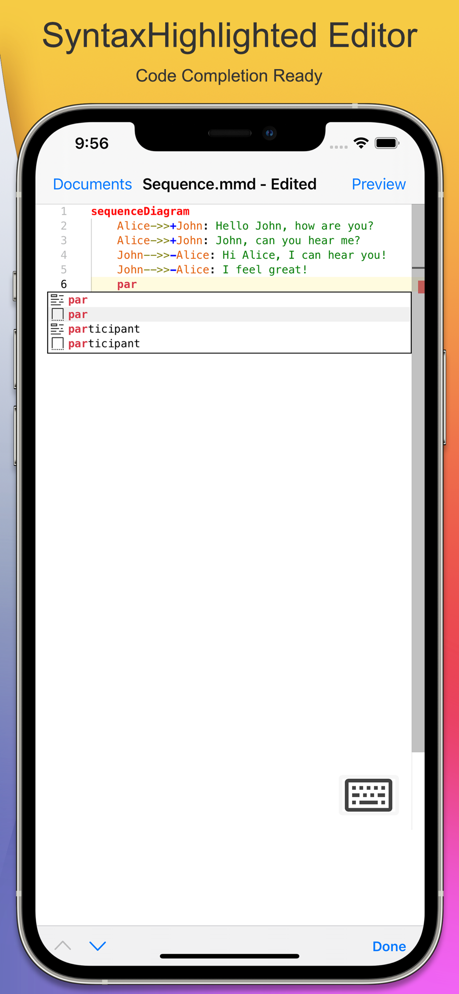 MermaidEditor supports mermaid-js syntax highlighting and code completion, so it can help writing diagram and chart clearly, easily and quickly.