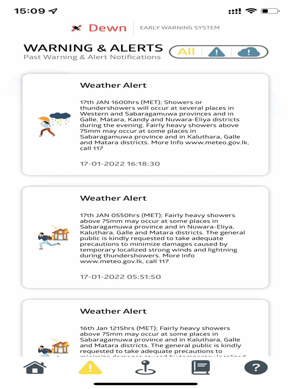 - Location: This APP will facilitate location based alerts very soon. We have built in the location map for you to know where the alert level is most relevant even if you are not in that area once DMC of Sri Lanka announces it.