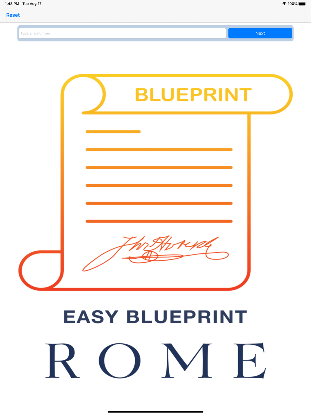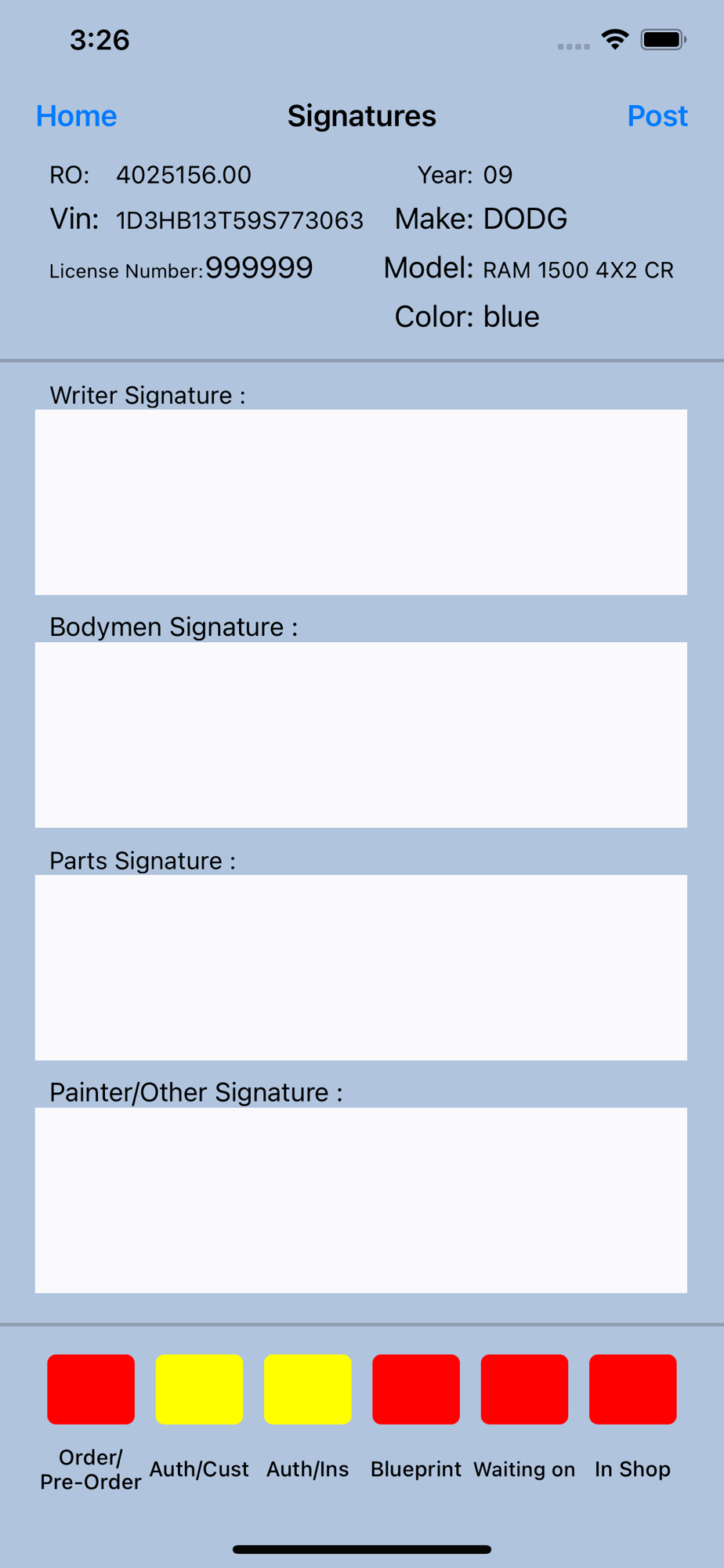 App is for uploading signatures to view in Rome Management. Type a repair order number to upload signatures to. Then select a type of signature you want to sign. Next sign and hit done. When ready to upload signatures, click 'post' to upload.