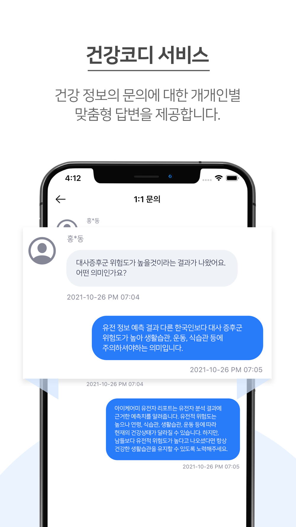 참여자의 마이데이터를 통해 건강관련 정보 및 맞춤형 건강관리를 제공하는 건강 코디네이터 서비스입니다. 운동 및 식습관 추천 정보 수행 미달자에게 건강 코디를 제안해 참여자들 개개인에게 맞춤형 서비스를 제공합니다.