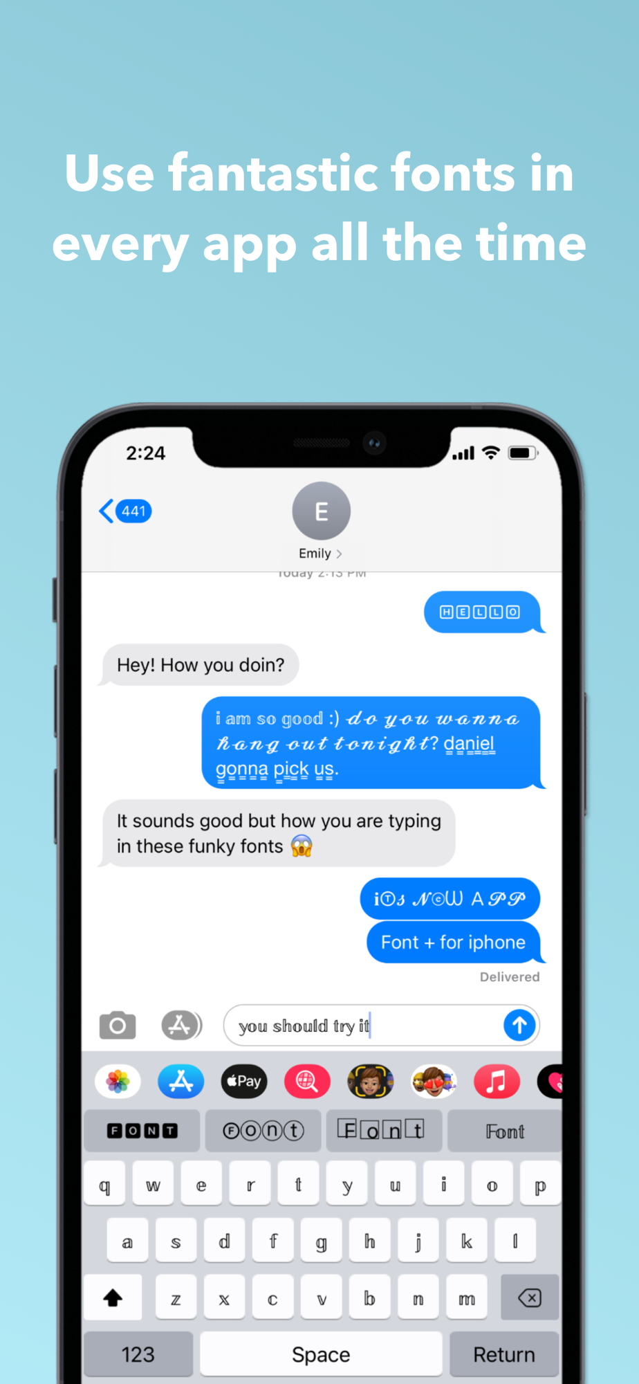 Using Font + is very easy. All you have to do is to choose your favorite font from the font selections that appear on your keyboard while typing and use it. Yes, it's that simple to use fonts that are perfectly styled.