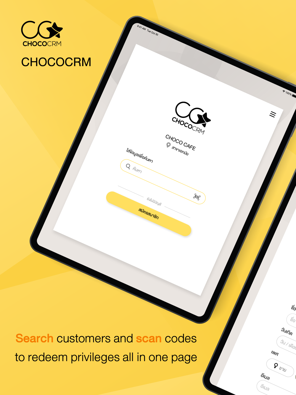 CHOCOCRM (ช็อกโก้ ซีอาร์เอ็ม) คือแอปฯ สำหรับการอำนวยความสะดวกร้านค้าที่ใช้งานระบบ CHOCOCRM เพื่อให้บริการลูกค้าของร้าน ทั้งในด้านการสมัครสมาชิก สะสมแต้ม และแลกของรางวัลให้กับลูกค้าของร้าน