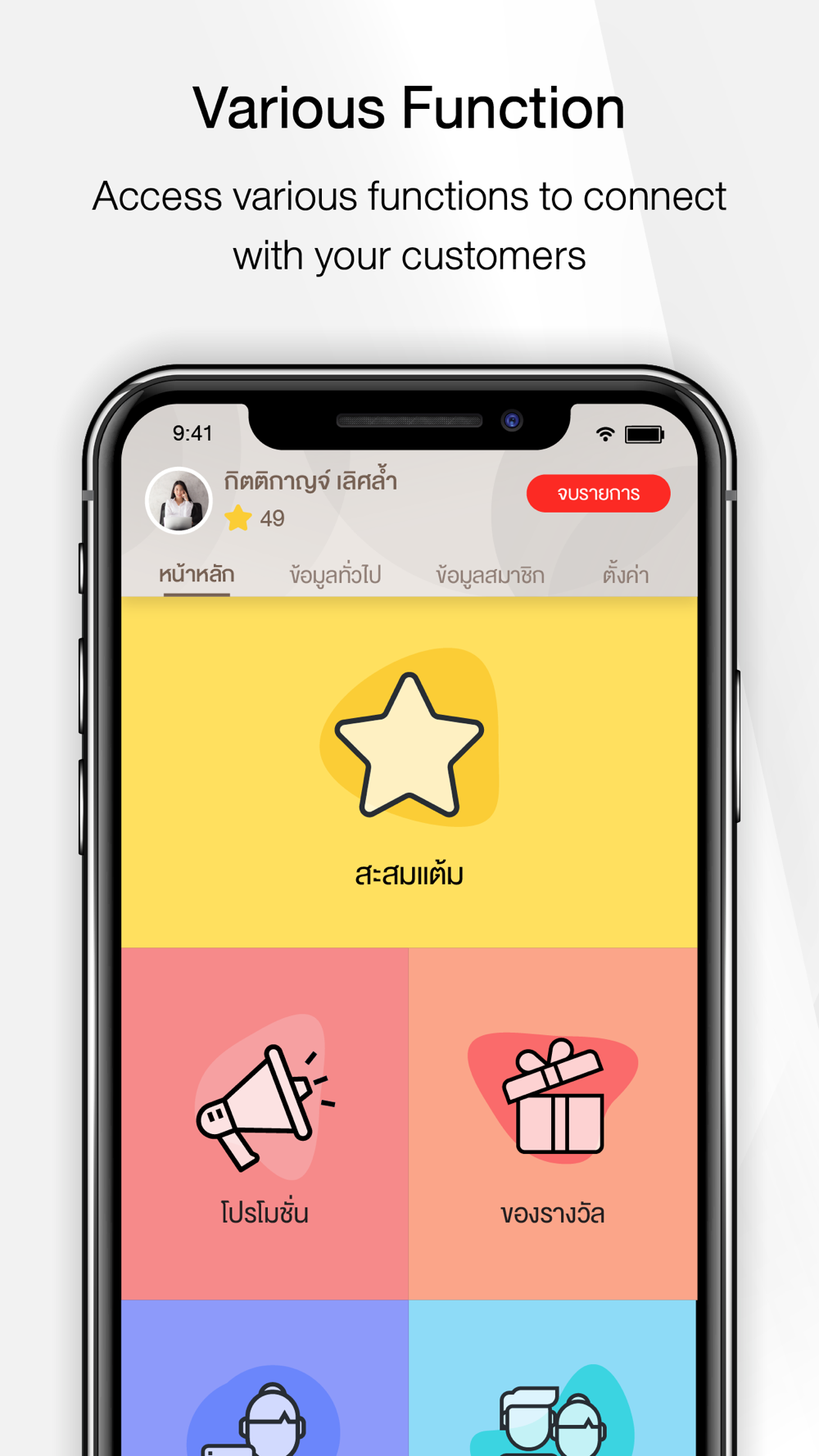 -สมัครสมาชิก : ฟังก์ชั่นสมัครสมาชิกและบันทึกข้อมูลลูกค้าของร้านลงในแอปฯ เพื่อนำไปวิเคราะห์ในเชิงการตลาด