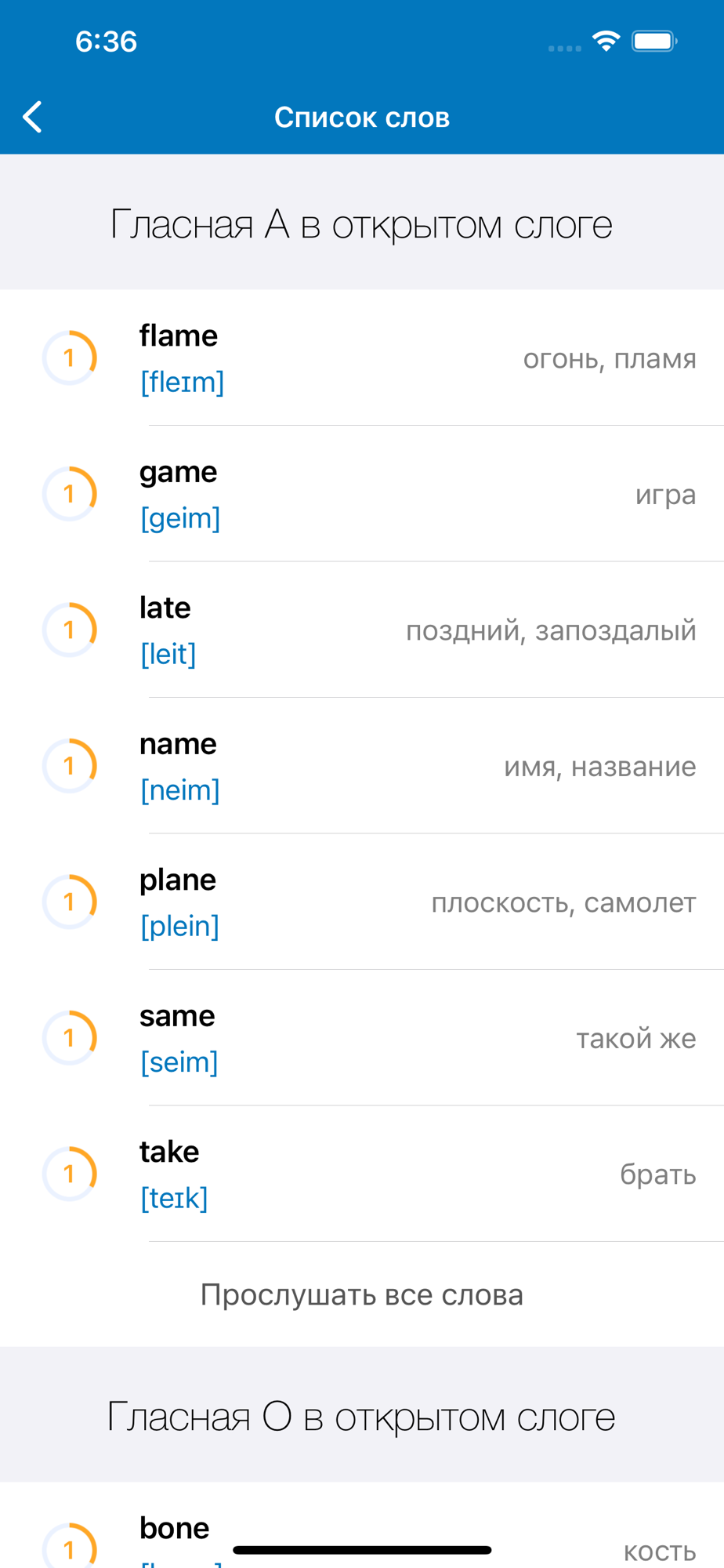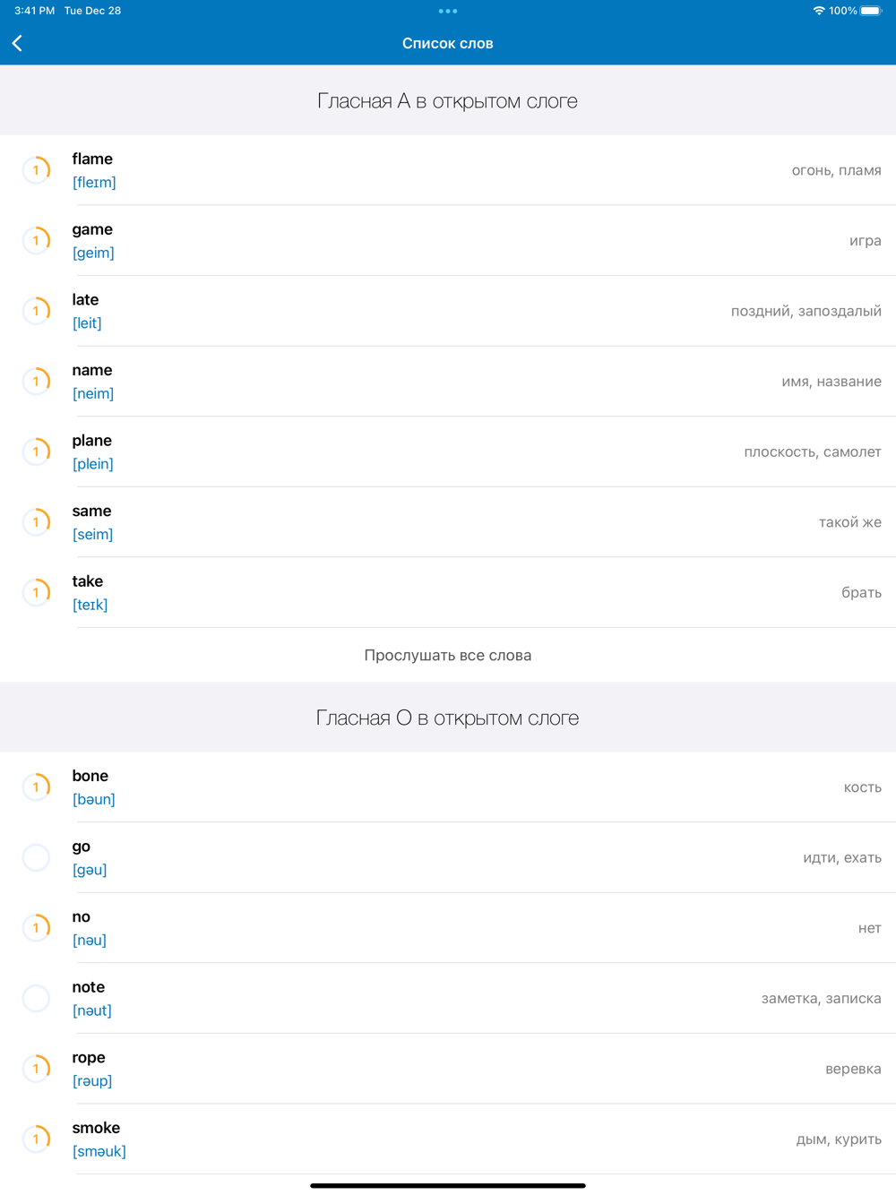 1. Вы повторяете слово за носителем языка, видите слово и его транскрипцию.