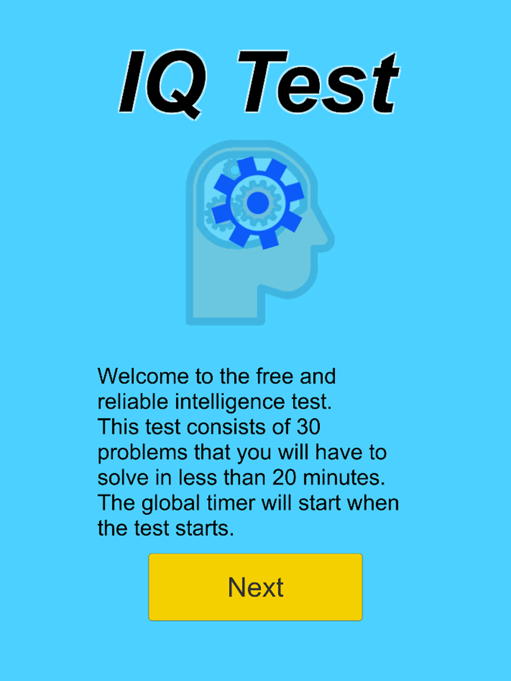 With this simple application, you will be able to know your level of intelligence and calculate your IQ easily and simply. You will only have to solve 30 problems in a maximum time of 20 minutes.