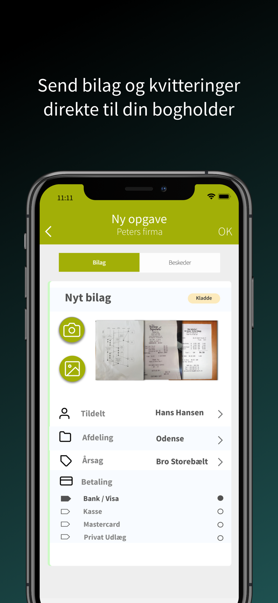 Kontor Fyn er din nemme løsning til at håndtere bilag. Du kan tage billeder af dine bilag eller fakturaer og sende dem direkte til din bogholder med mulighed for at vælge afdeling, projekt, årsag og betalingsmetode.