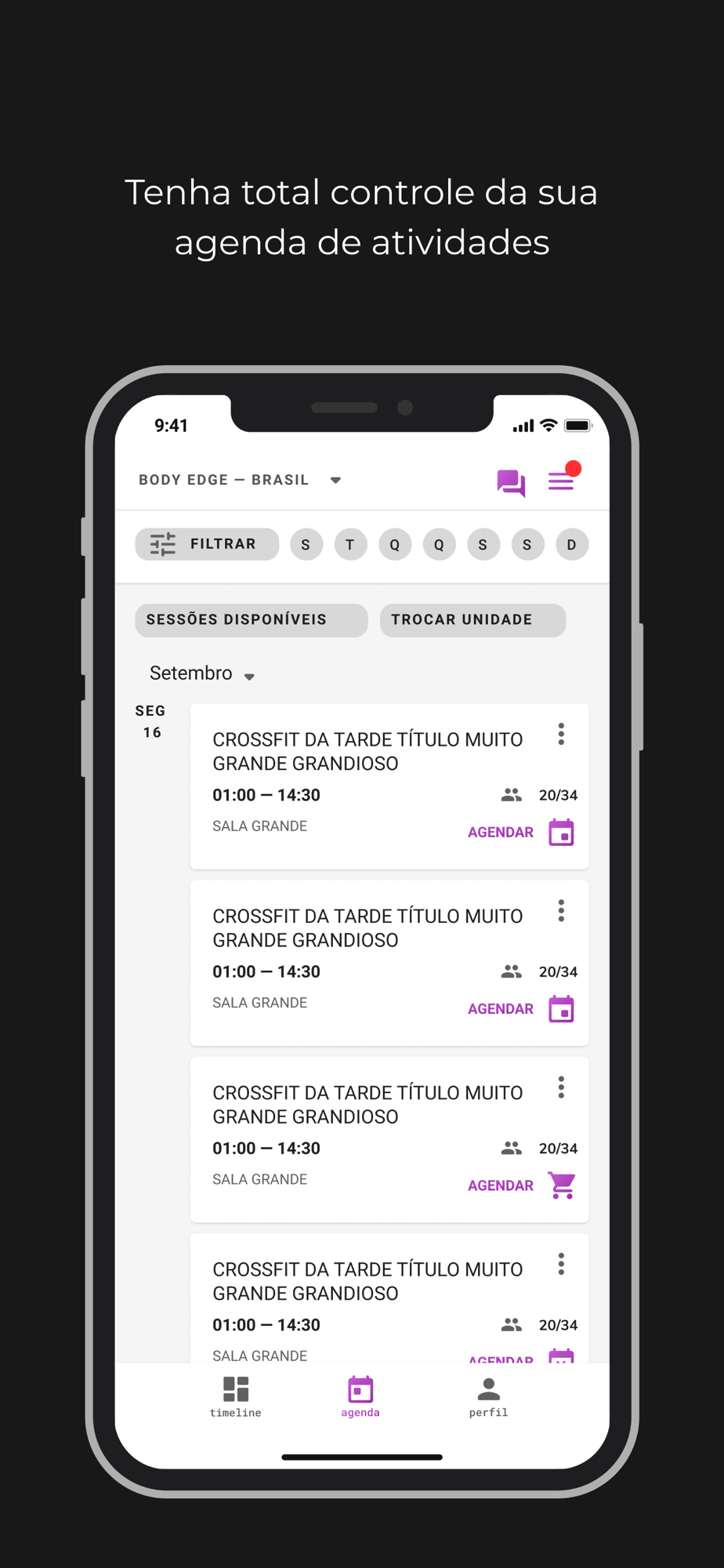 - Consulte a AGENDA de aulas: faça check-in, consulte horários, reserve lugar na sala e, se aula que você quer estiver lotada, seja notificado assim que tiver vaga disponível!
