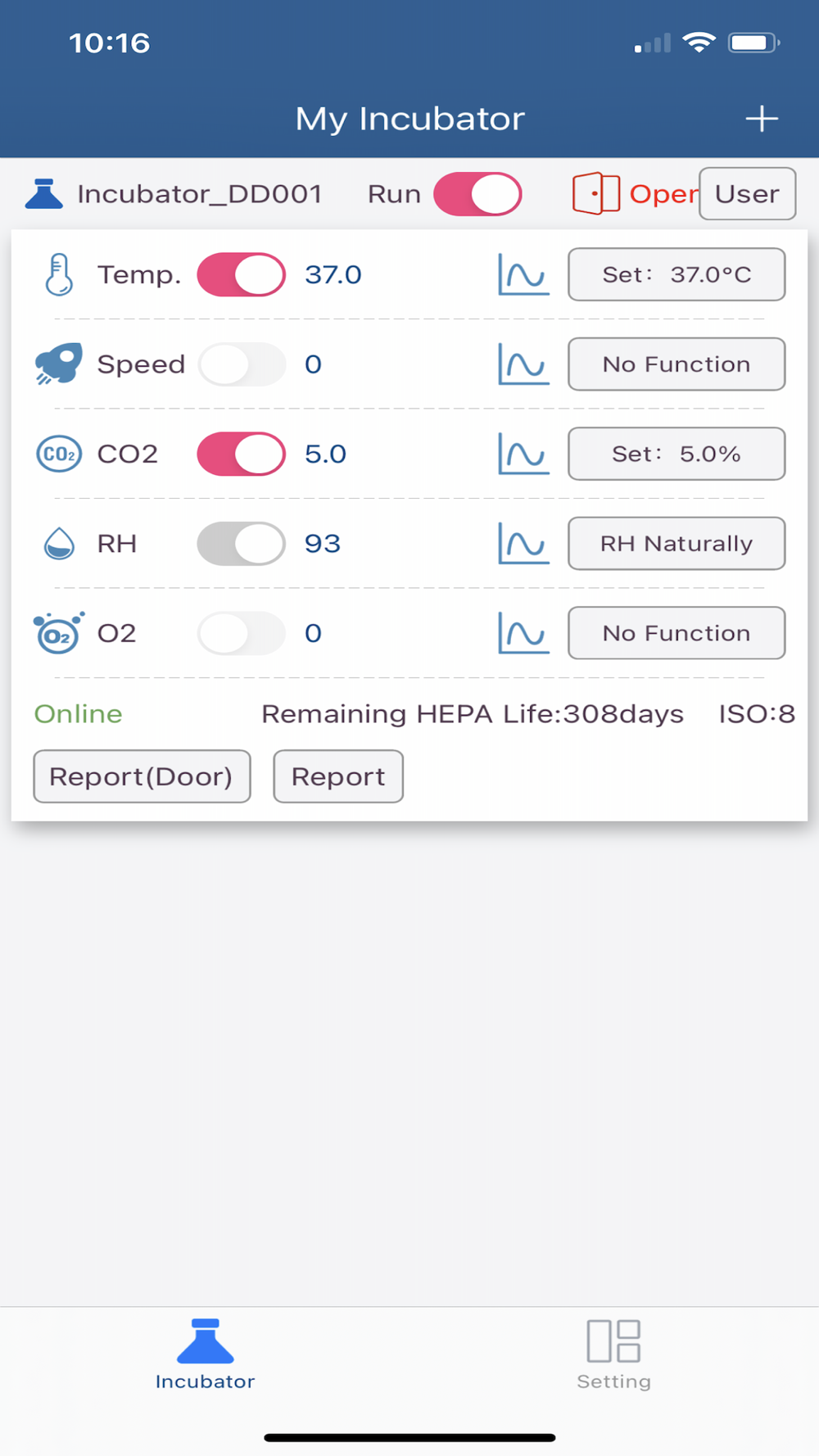 This AIREA Remote Monitoring app lets you control your CTI CO2 Incubator right from your phone using a wi-fi connection. This app gives you the ability to set and change the incubator’s parameters, including temperature and CO2 concentration. The IncubatorMate also collects data related to changes in these parameters, allowing you to monitor the performance of your set parameters and to visualize any changes over time. The app also includes alarm functions to alert you via text if any of your parameters fluctuate outside of a specified range and within the app if the doors open while the instrument is operating.