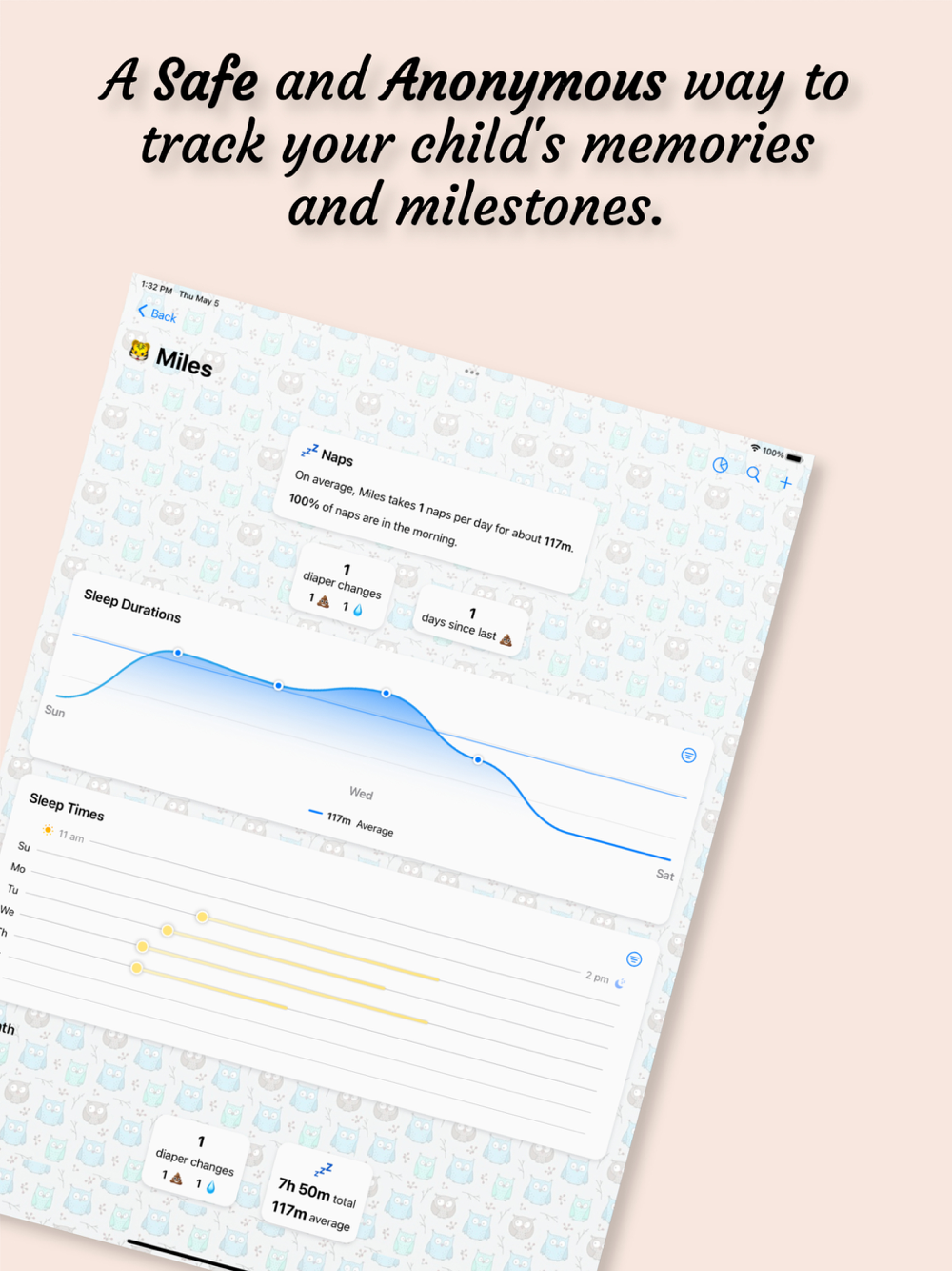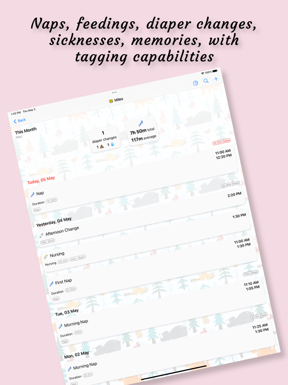 - Tracking for your child's sleeping, feeding, and diaper changes with tagging capabilities