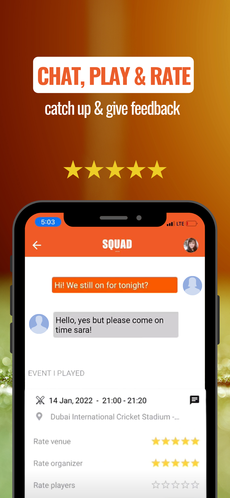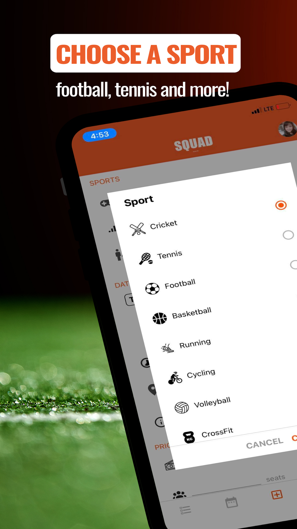 Find partners near you. Make your event private or public. Invite friends to SQUAD XYZ. Let them join your sport activities and check who is coming and who has declined. Rate the players at the end of each game.