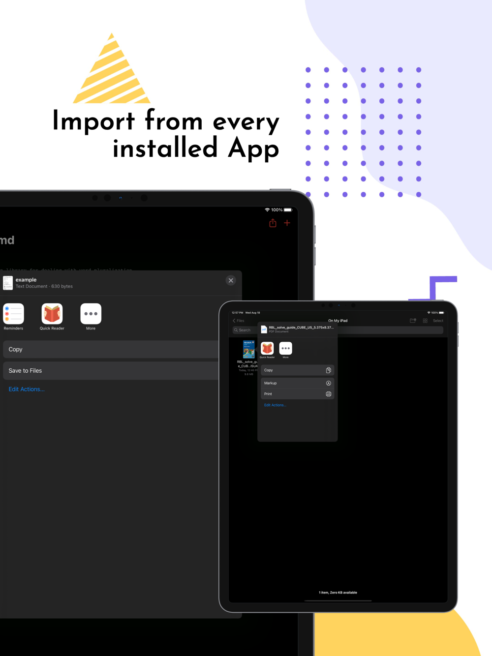 A simple universal file reader, that allows you to open or import any kind of file and read in the app from everywhere!