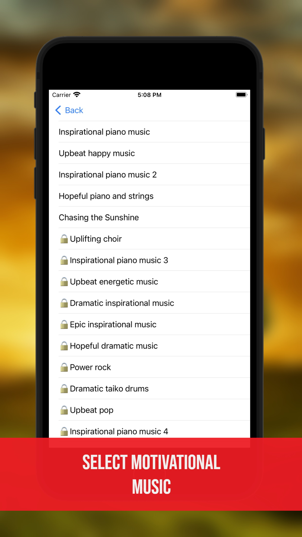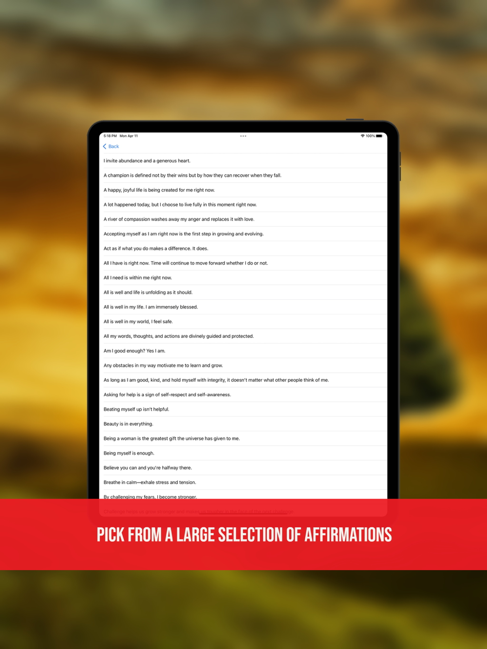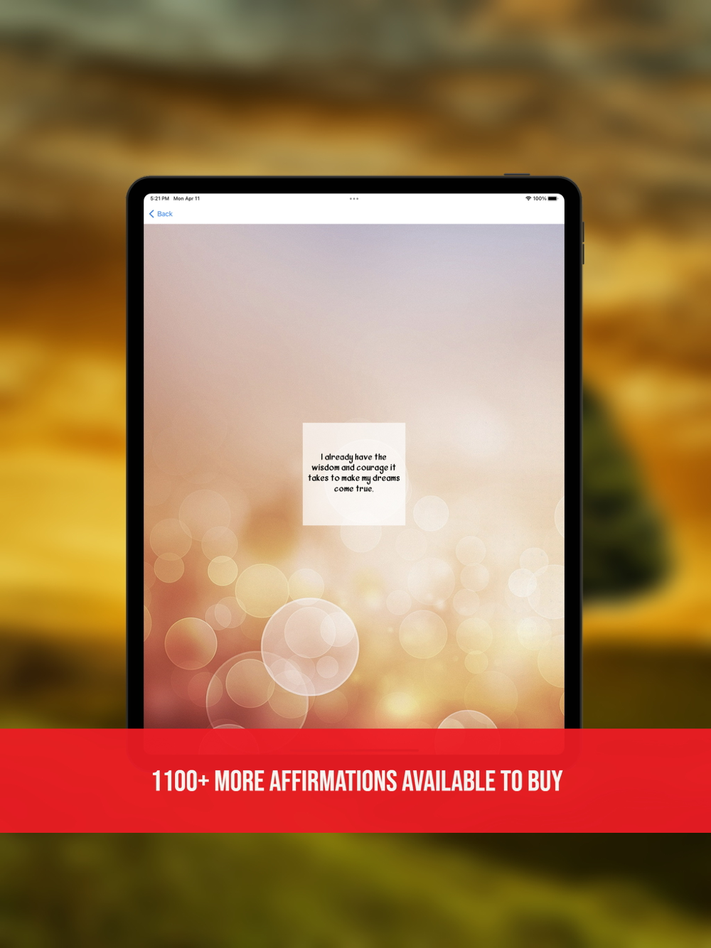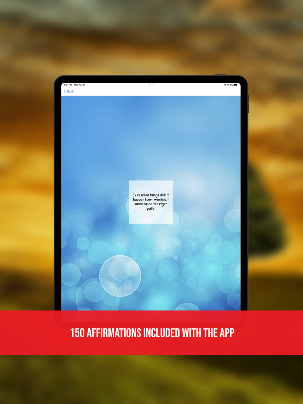 Uplifted provides an attractive and inspiring environment for users to practice affirmations. Users select a beautiful background, motivational music, and the positive affirmation that they wish to work with. In combination, these aspects all work together to create an inspiring environment that facilitates the easy use of affirmations to help reprogram the way you think and thereby improve the quality of your life.