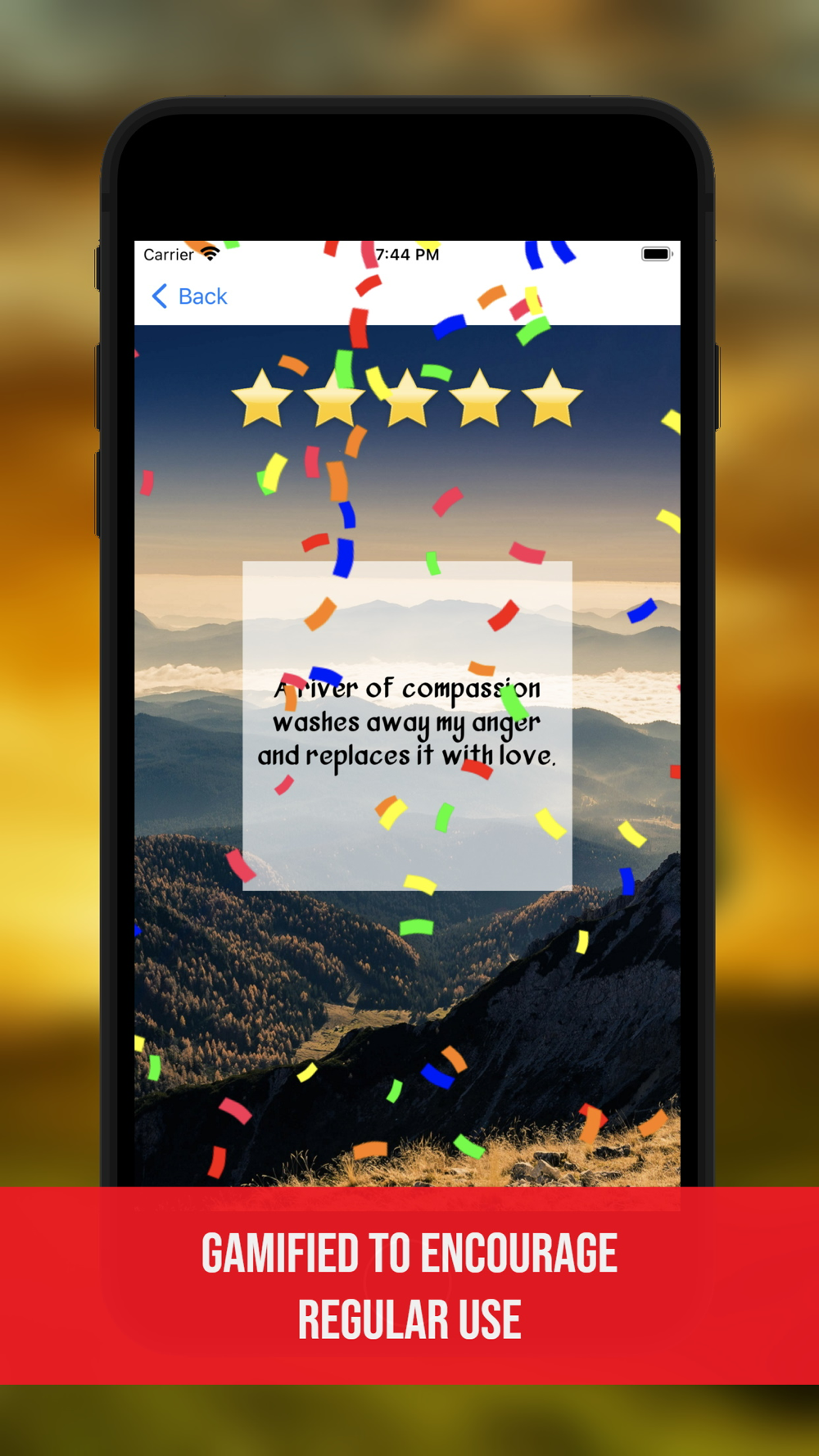 Uplifted uses the world's only gamified affirmation system. Affirmations are most effective when used regularly. Users are encouraged to regularly repeat affirmations by being rewarded with a star for every minute they repeat an affirmation. A maximum of five stars can be gained in any single affirmation session. After being rewarded with five stars users are further rewarded with a celebratory shower of confetti. Stars that are earned are cumulatively added to a global leaderboard for every user. There are also a variety of achievements that can be earned by gaining certain numbers of stars. The overall effect of this gamification is to encourage users to regularly repeat affirmations so that they reap the rewards associated with regular practice.