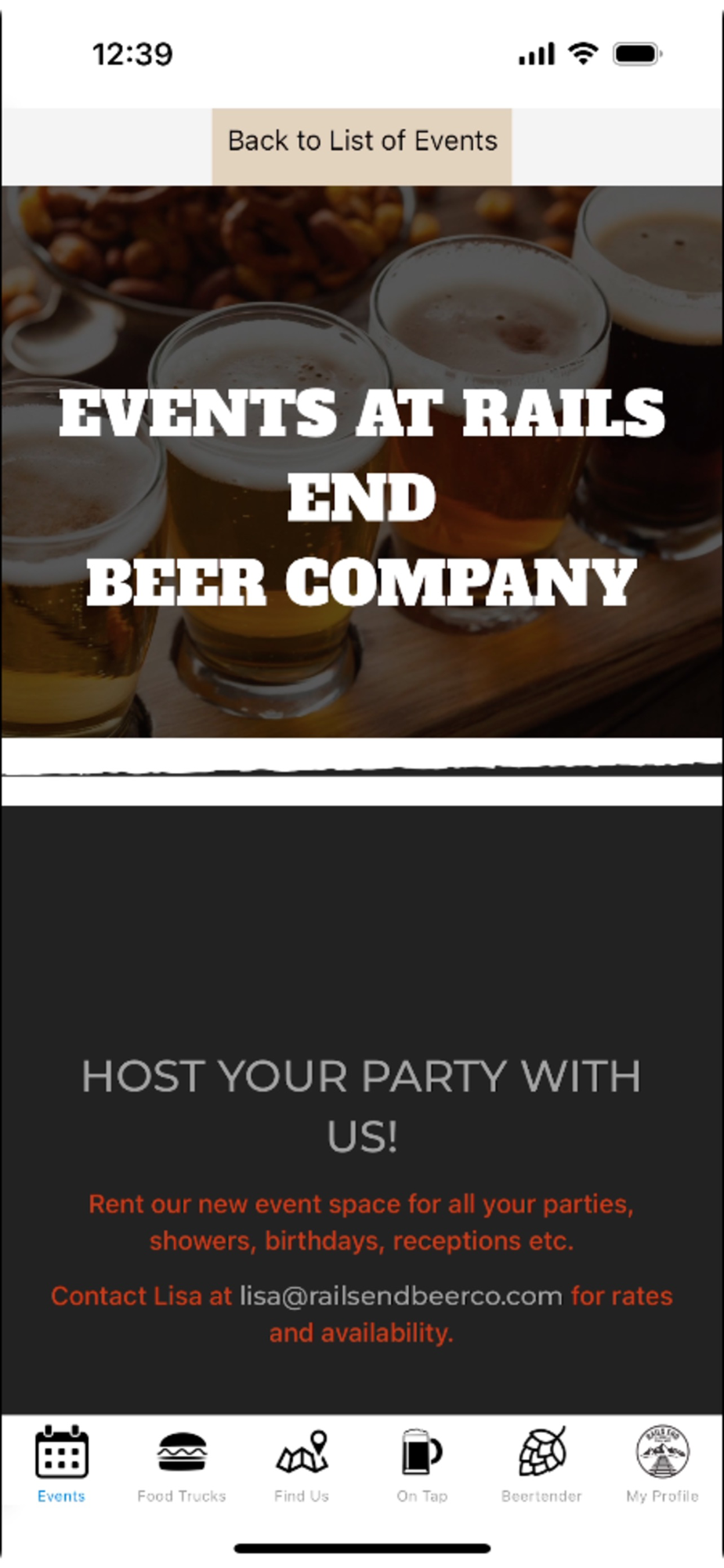 Rails End Beer Company Mobile App. Check what Events are upcoming, what food trucks are there, where you can find Rails beer and what beers are currently on tap at the brewery.