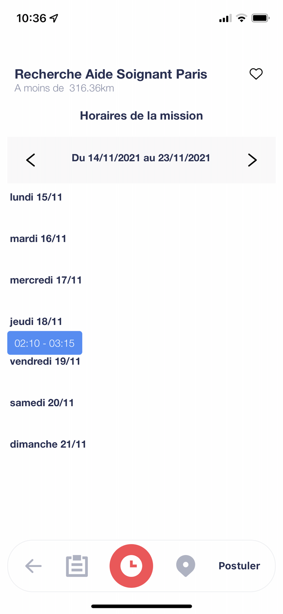 Le soignant sélectionne les jours et les horaires qui lui conviennent, et postule.
