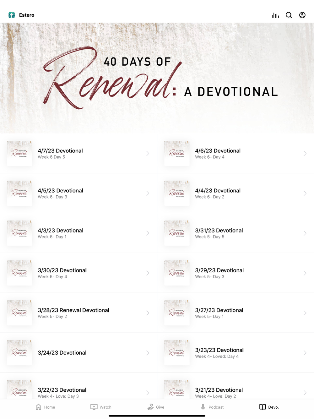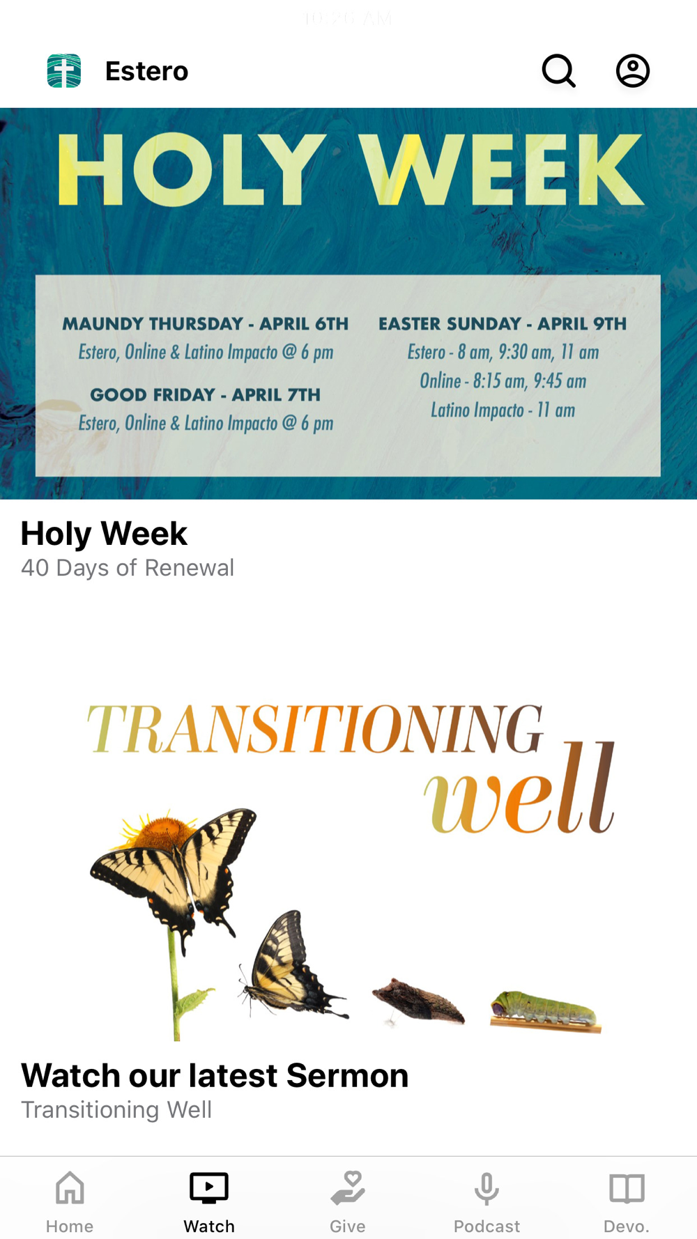 Download the Estero Church app for various resources including sermon videos, event/small group sign ups, and online giving.