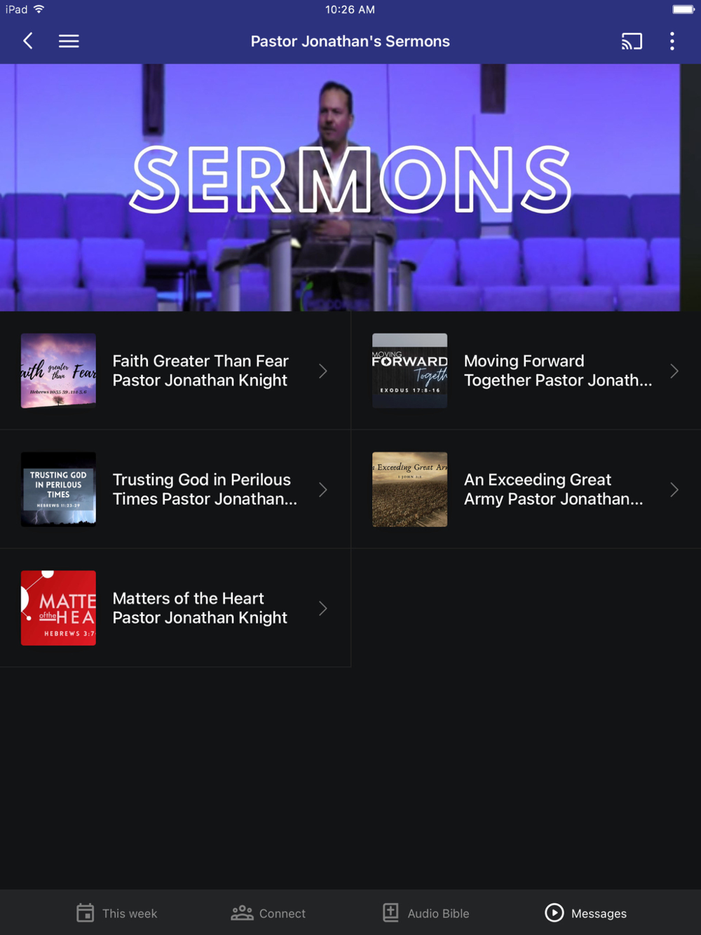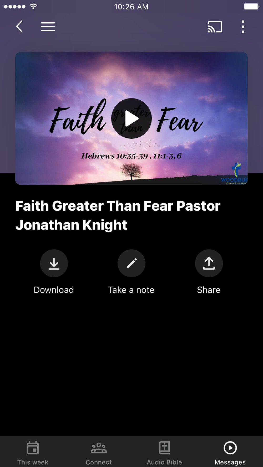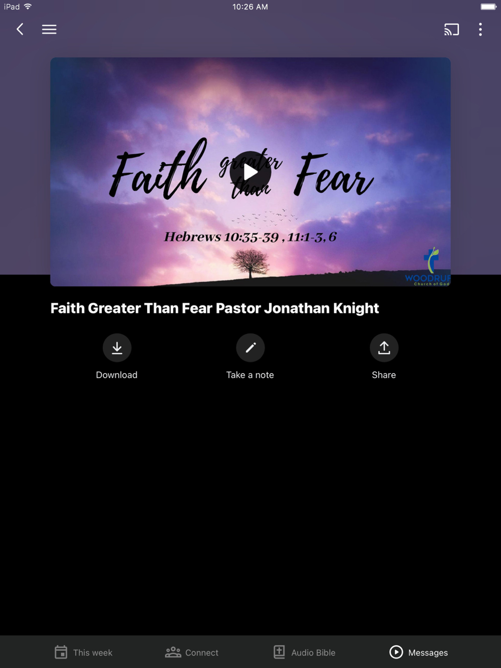 This app will help you stay connected with the day-to-day life of Woodruff Church of God. With this app you can: watch or listen to past messages; stay up to date with push notifications; share your favorite messages via Twitter, Facebook, or email; and download messages for offline listening.