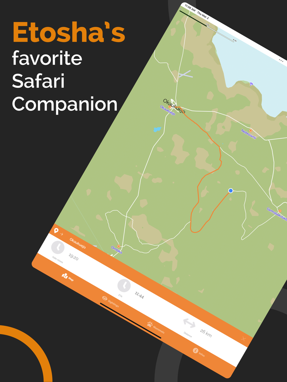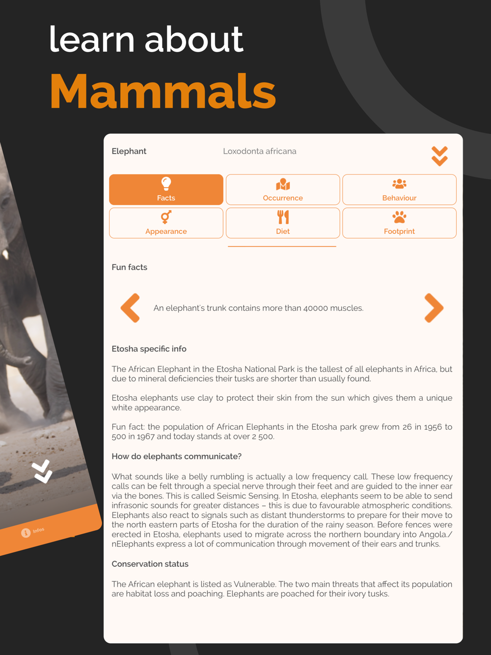 Namibia's most downloaded safari guide is a must-have for any tourist visiting Etosha or Namibia. With our unique interactive map, which requires no internet, you can easily navigate through Etosha National Park to any waterhole you desire. Leave your bulky mammal guidebooks at home - the Etosha App mammal guide provides you with detailed information on all mammals found in the Etosha National Park. This is not only useful during your stay in the park, but also for the remainder of your safari in Namibia and other southern African countries.
