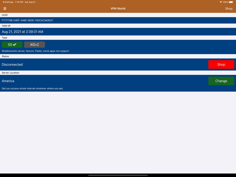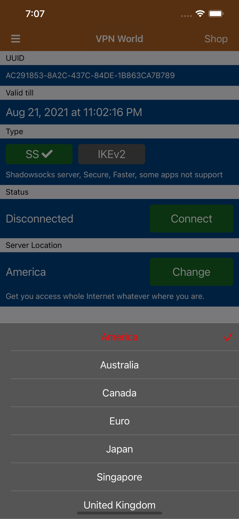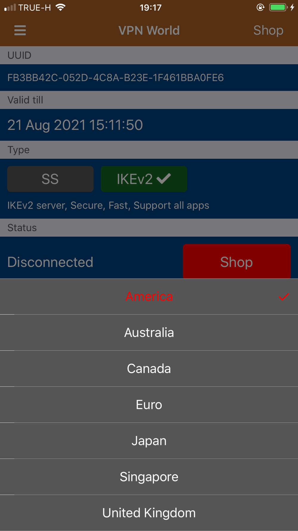 Can select many different fast server location, like America, Hongkong, Singapore, Japan, Canada, Australia, United Kingdom, Euro etc.