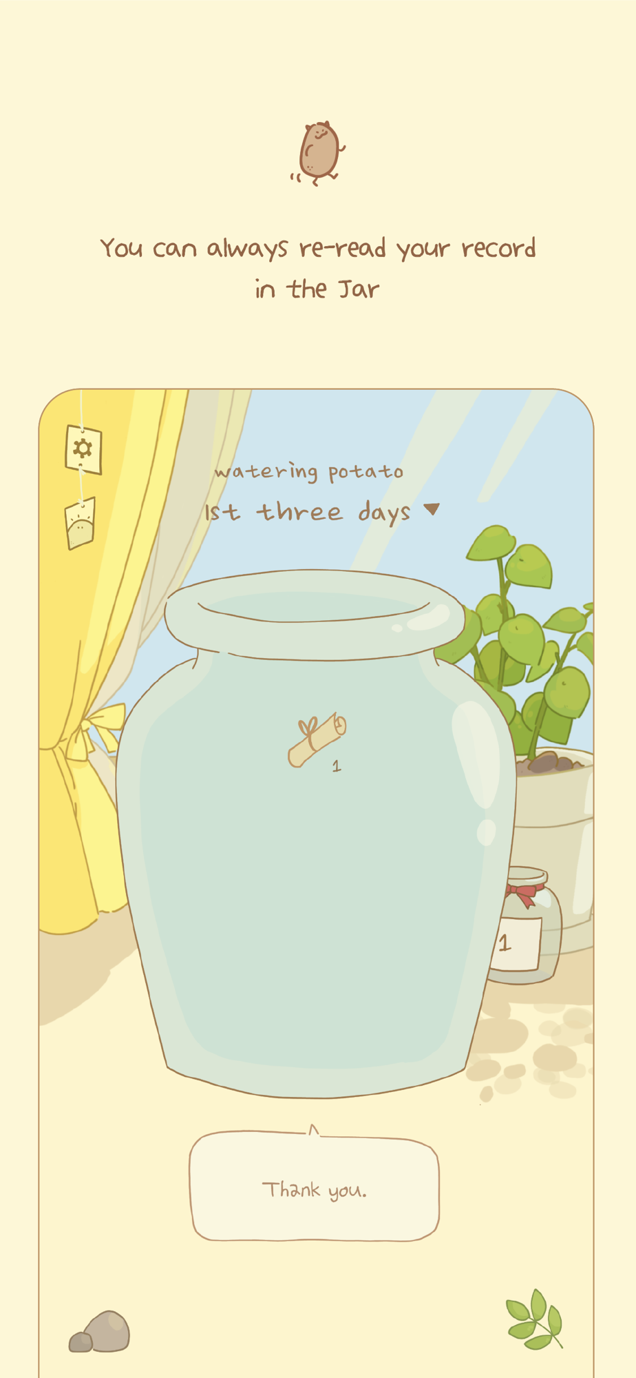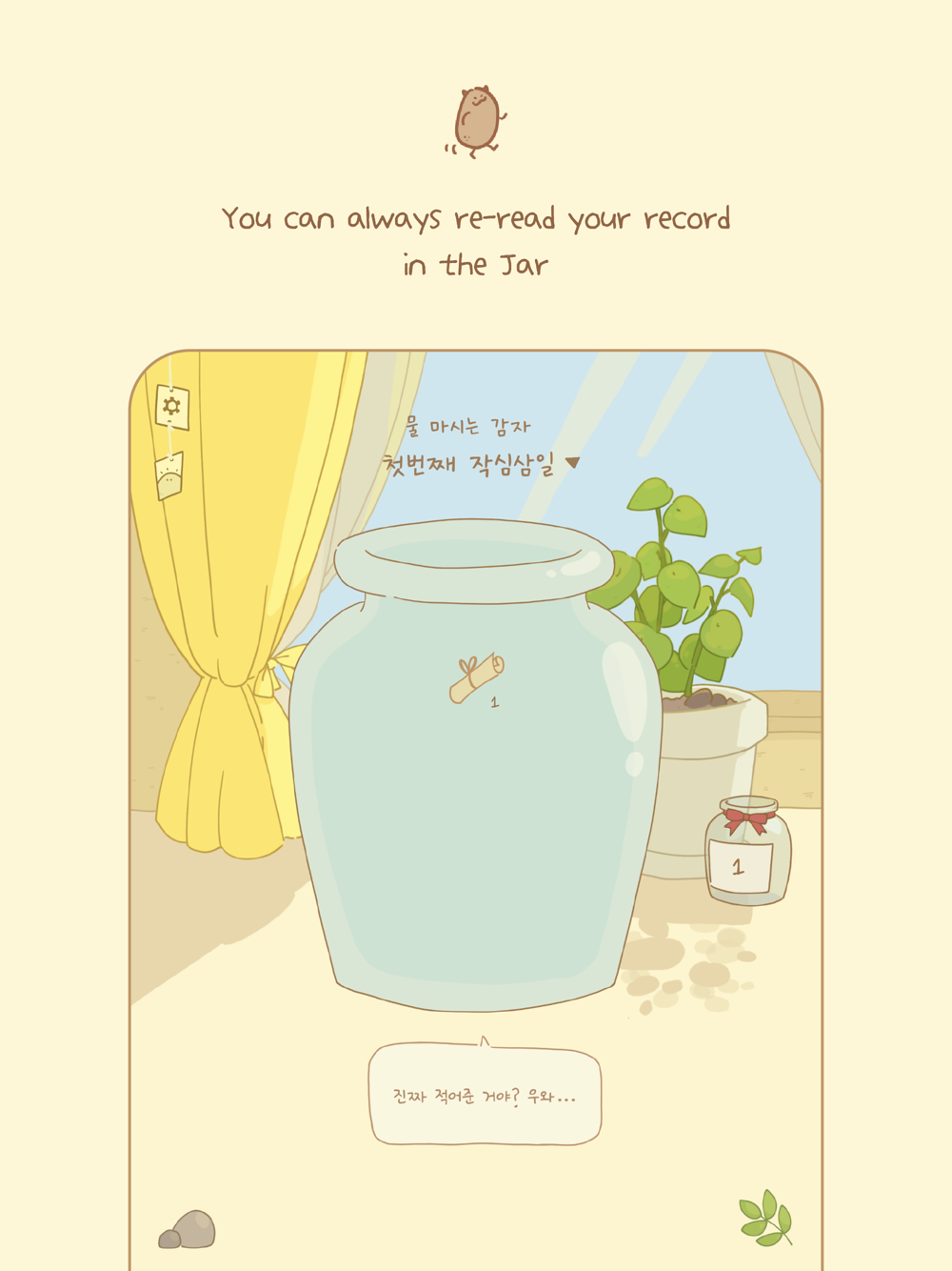 2. Your potato friend will tell little stories and ask you something everyday. Record your day by answering potato friend's question. 21 days won't be so long! After 21 days you can see all your records collected in a paper.