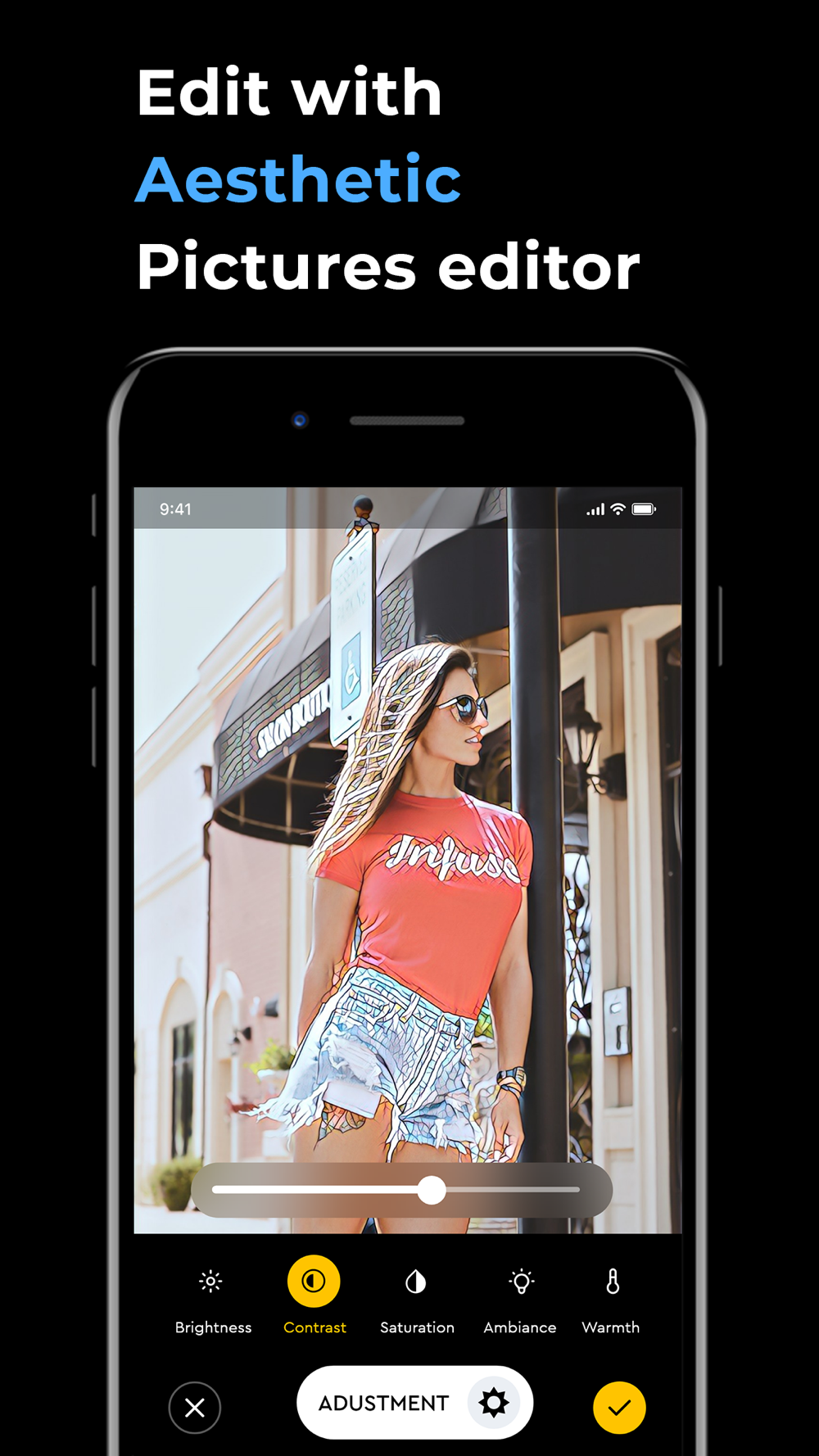 =>Photo adjustment tool: contrast, saturation, brightness, shadows, temperature and sharpness