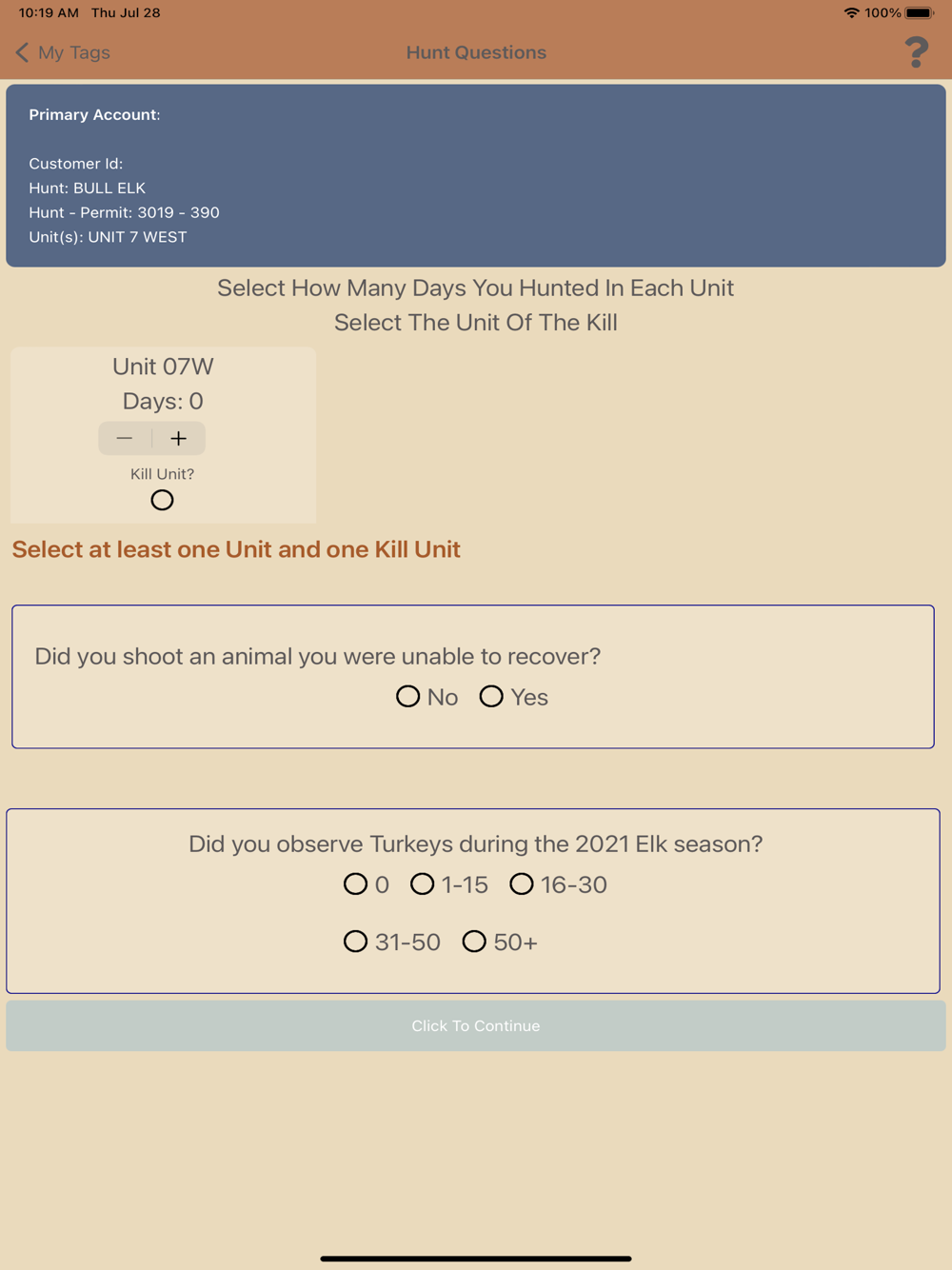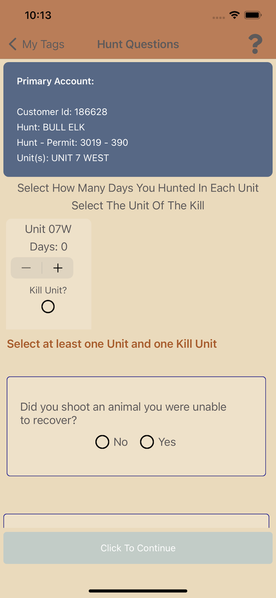 Resolved issue with antlered hunts toggling between a broken antler and selecting the number of points.Miscellaneous interface improvements to aid answering the hunter questionnaire.Improvements to E-Tag app stability.