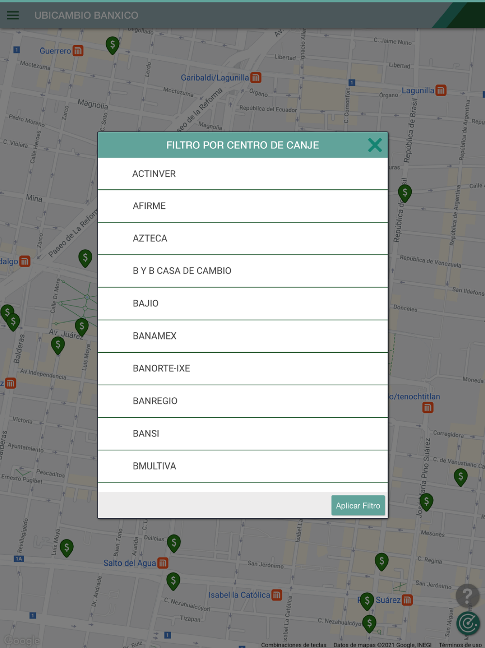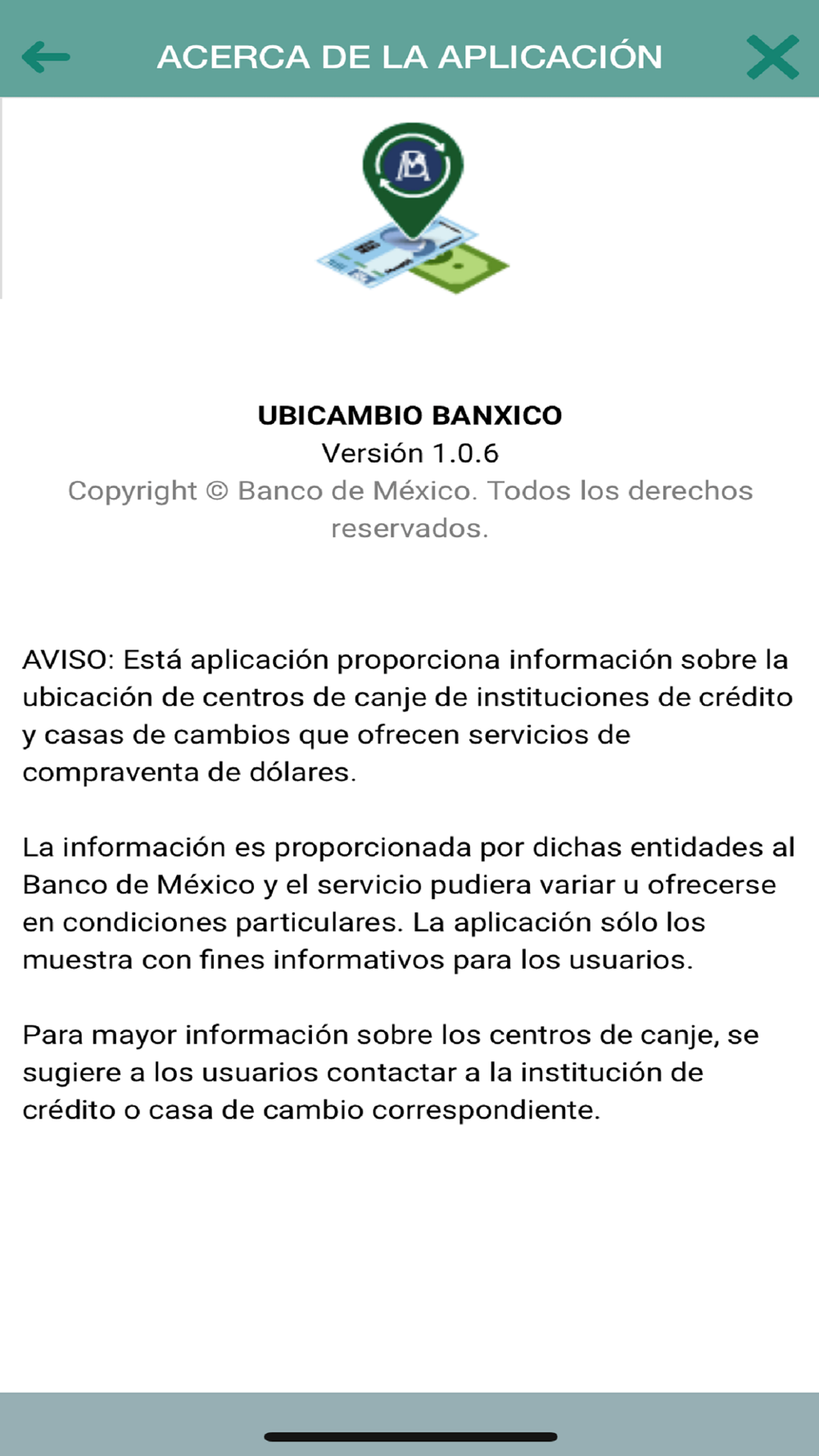 Está aplicación proporciona información sobre la ubicación de centros de canje de instituciones de crédito y casas de cambios que ofrecen servicios de compraventa de dólares.