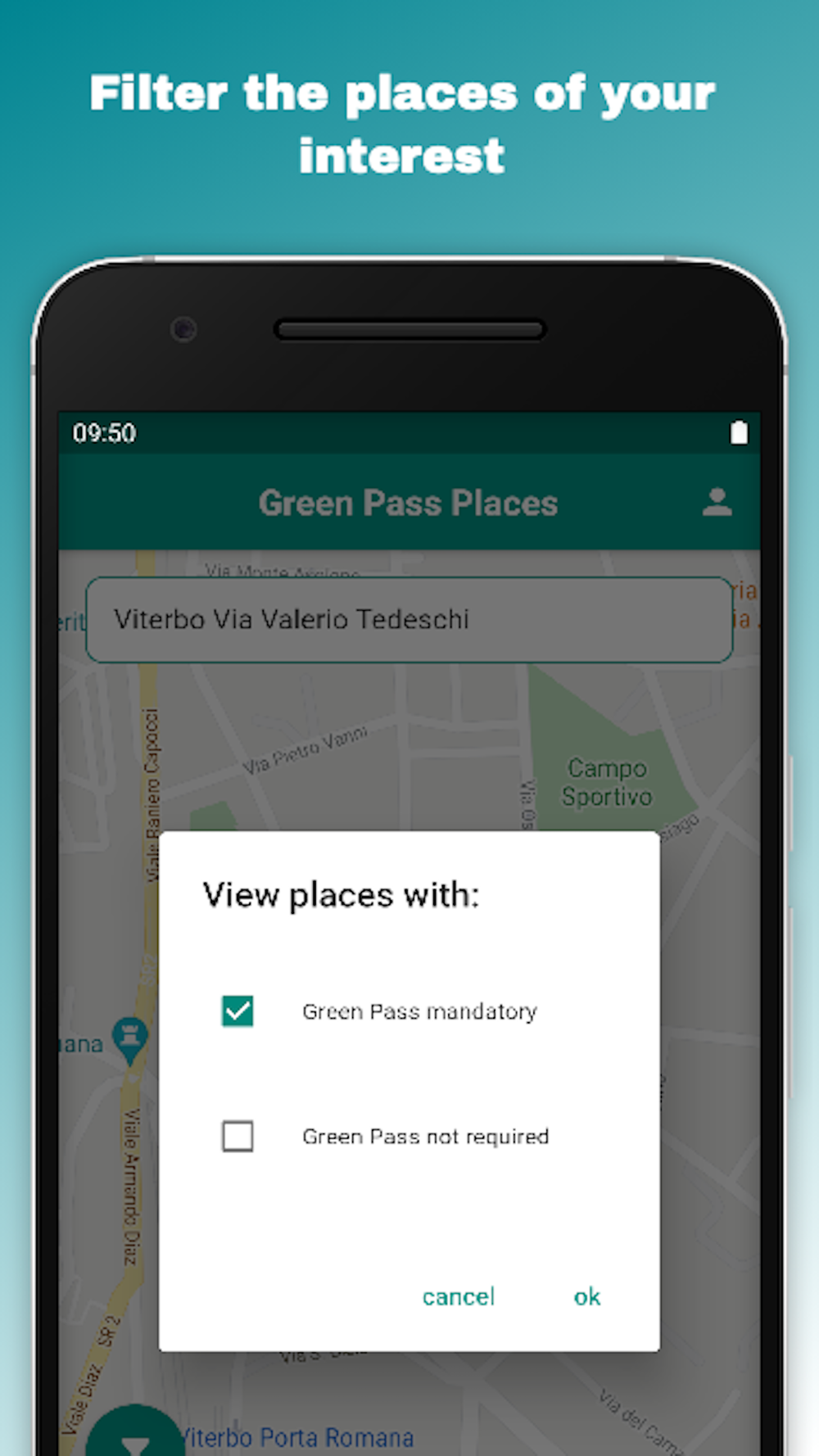 The Green Pass Places app allows you to view on the map all the details of the public places in the selected area, including whether or not you need a Green Pass to access the place.