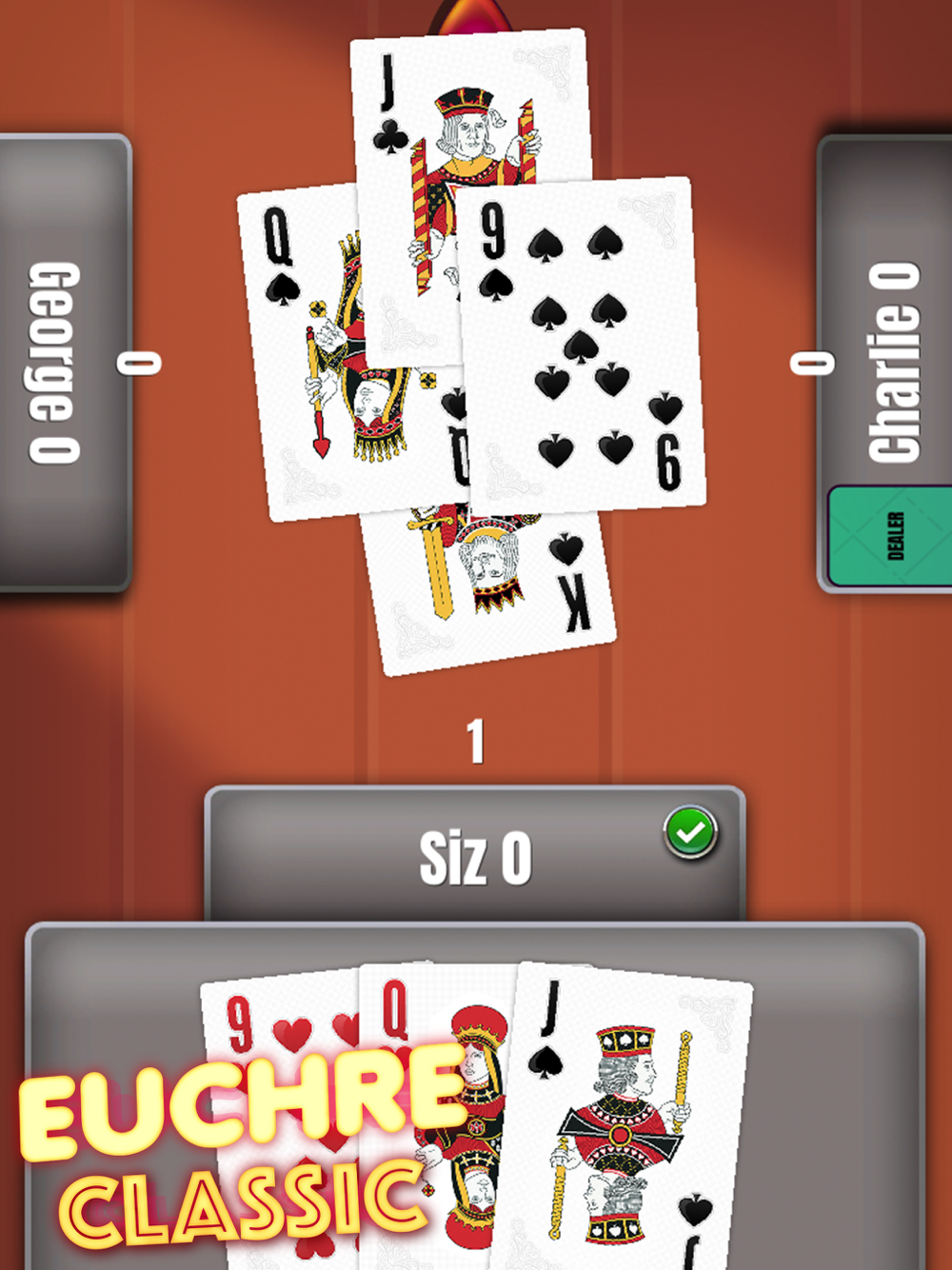 It's widely played in the United States, where it's also known as Bacon, and in other English speaking countries. In Euchre Free you play with 3 other players, forming 2 teams, and the deck in play consists of the 9, 10, J, Q, K, and A cards. There is always a trump and your objective is to score 10 or more points. You get these points in matches with 5 tricks, where the team that scores the most points and tricks wins.
