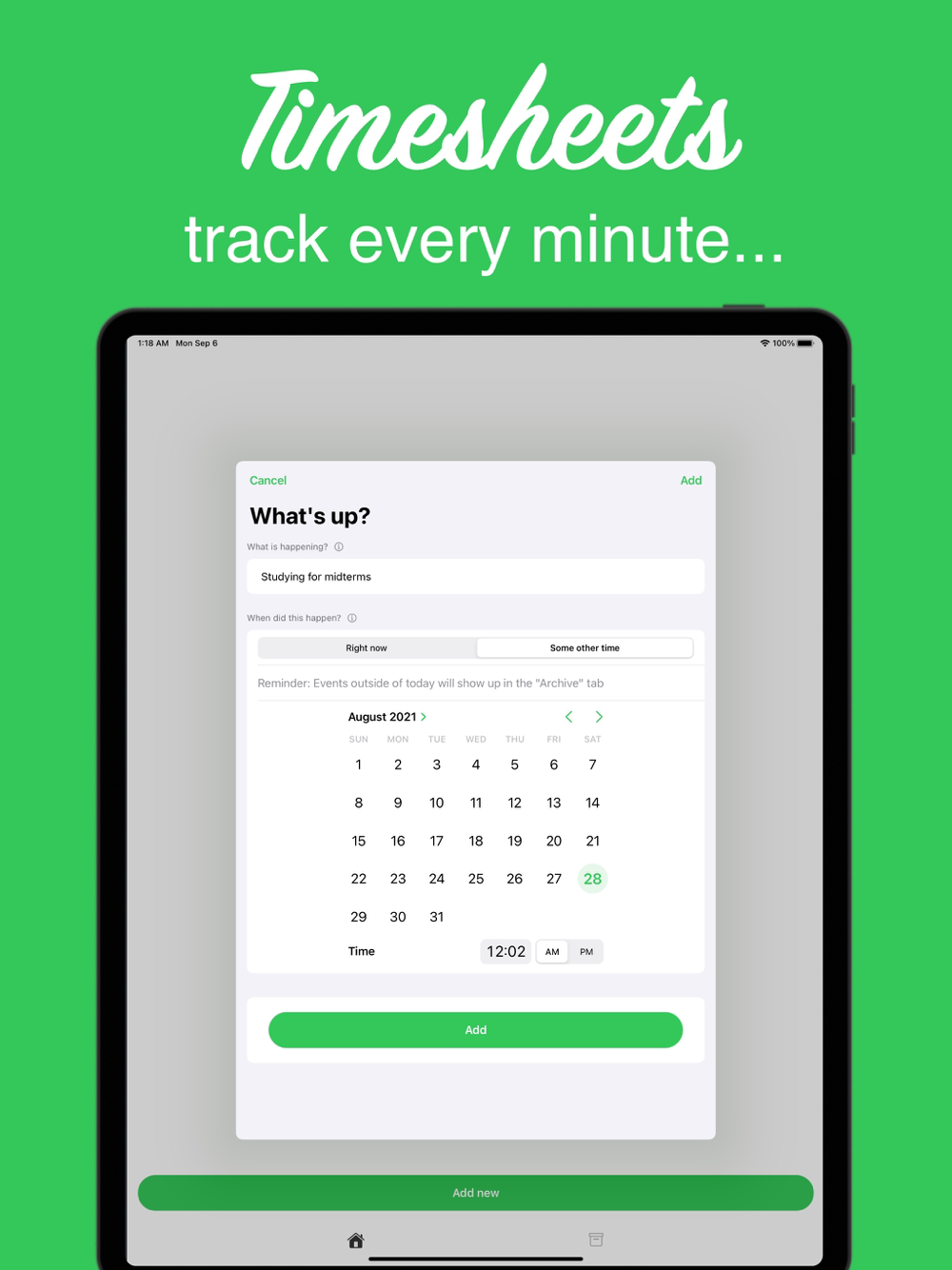 Tap the "Add new" button, then type what you are doing, optionally add a specific time, then add to your timesheets. It's that easy!