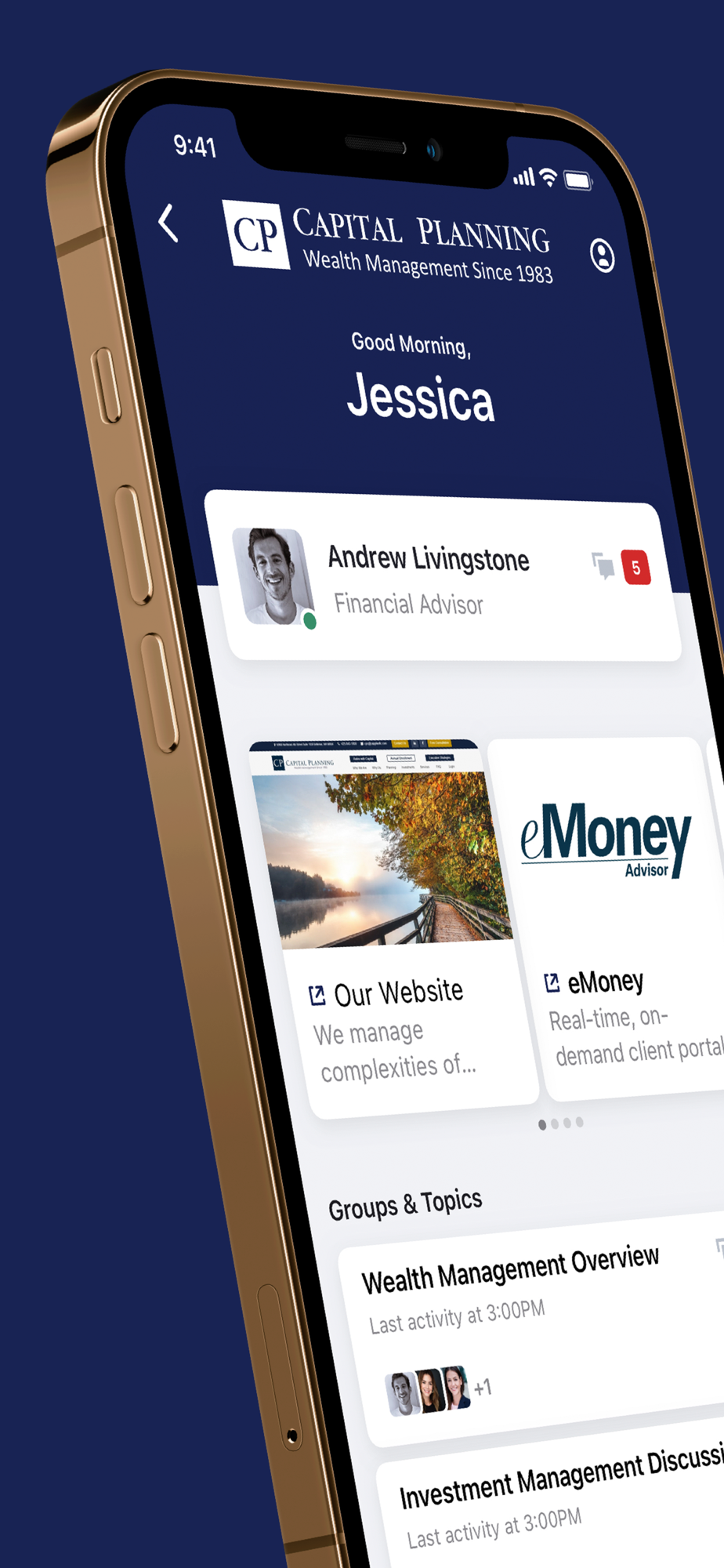 Capital Planning Connect enables our firm to be digitally available to our clients, no matter where they are. Use our app to connect with advisors and teams through text, voice, and video messaging, securely send files, schedule video conferences, digitally sign documents, and more.