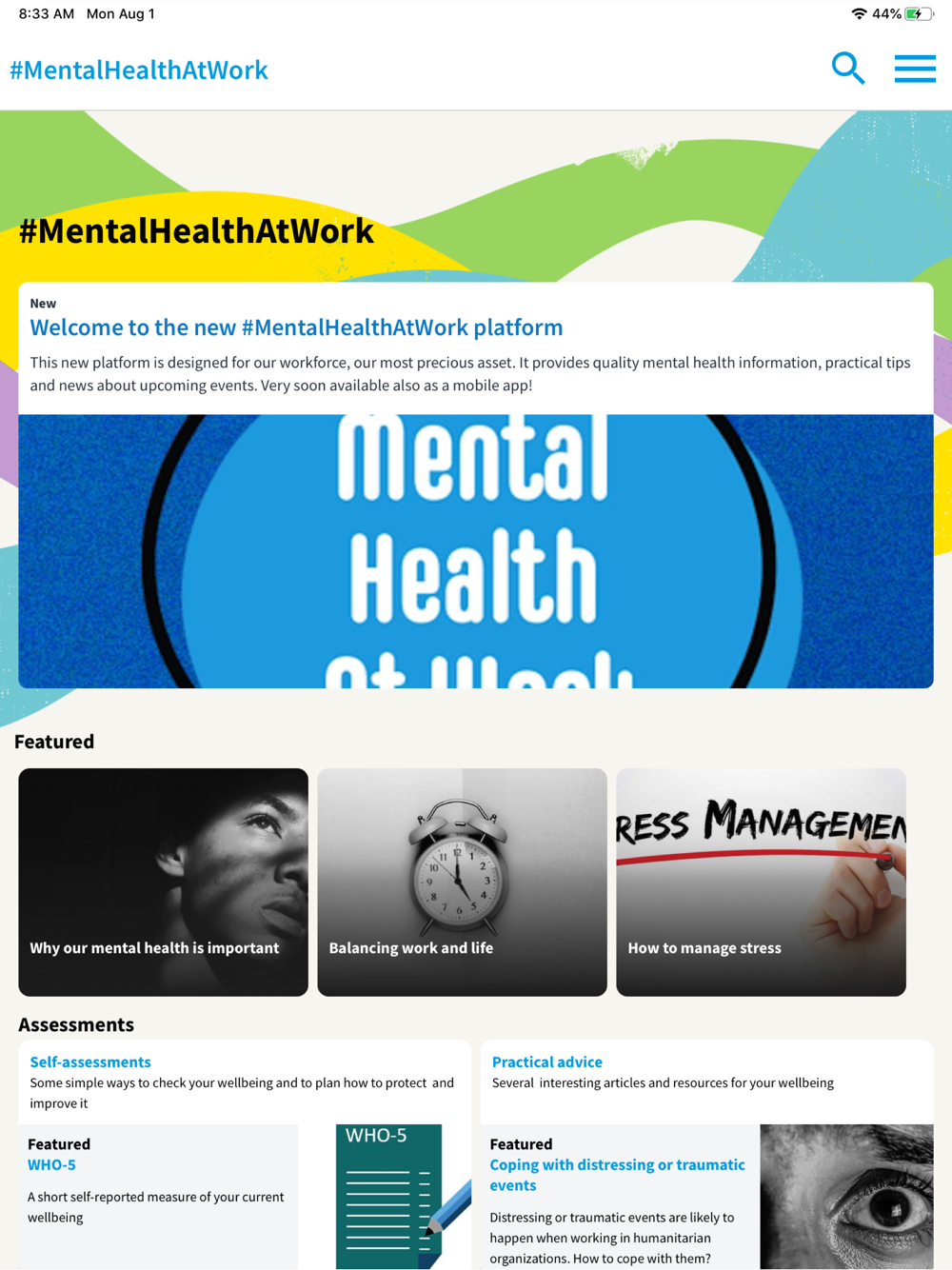 WHO Wellbeing app is designed for WHO workforce worldwide to provide them with practical help and guidance related to their mental health and psychosocial wellbeing. The WHO Wellbeing app offers an opportunity for self-assessment with instant feedback, learning more about mental health issues through easy-to-read articles, videos and links. Upgrades in terms of content and functionality will be made regularly on the basis of the users’ feedback. The WHO Wellbeing app does not collect personal information from any of the offered tools and the users can rely on the confidentiality of their information.