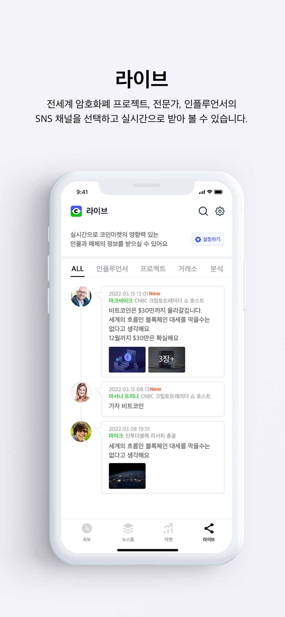 관심있는 전세계 암호화폐 프로젝트, 전문가, 인플루언서의 SNS 채널을 선택하고 소식을 실시간으로 받아 볼 수 있습니다.