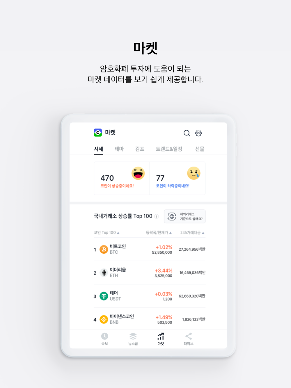 1) 시세 : 국내·외 거래소의 상승률 TOP 100 암호화폐를 한눈에 볼 수 있습니다.