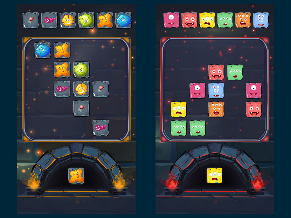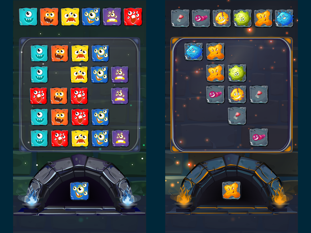 When we put 3 monsters of the same shape side by side, they will merge into the next powerful monster.