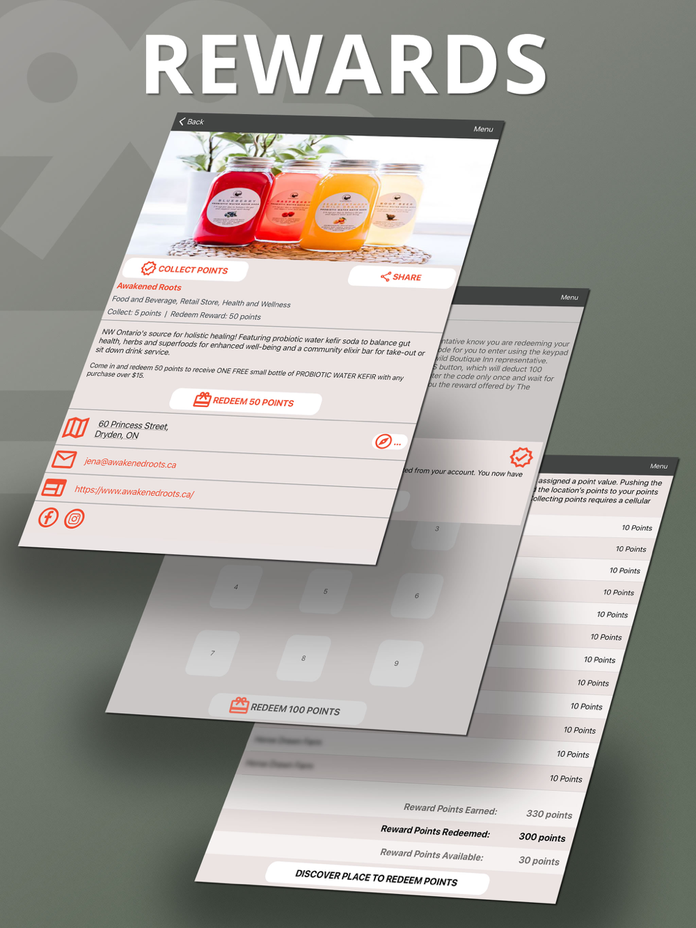 Once you collect enough points, those points can be redeemed for goods or services at Dryden Trailblazer reward locations. Reward locations are indicated in the app. Select the place where you would like to redeem your reward. Tapping the “Redeem Rewards” button, while physically at a rewards location, will bring up a keypad for the place owner to enter a code to deduct points from your point total in exchange for your reward. You must have an internet connection to redeem points.
