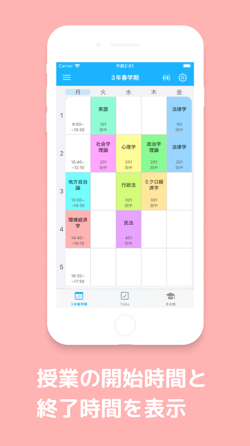 右上の「目のアイコン」を押している間、授業の「開始時間」と「終了時間」を表示できるようにしました。右上の「歯車アイコン」から時間を設定できます。