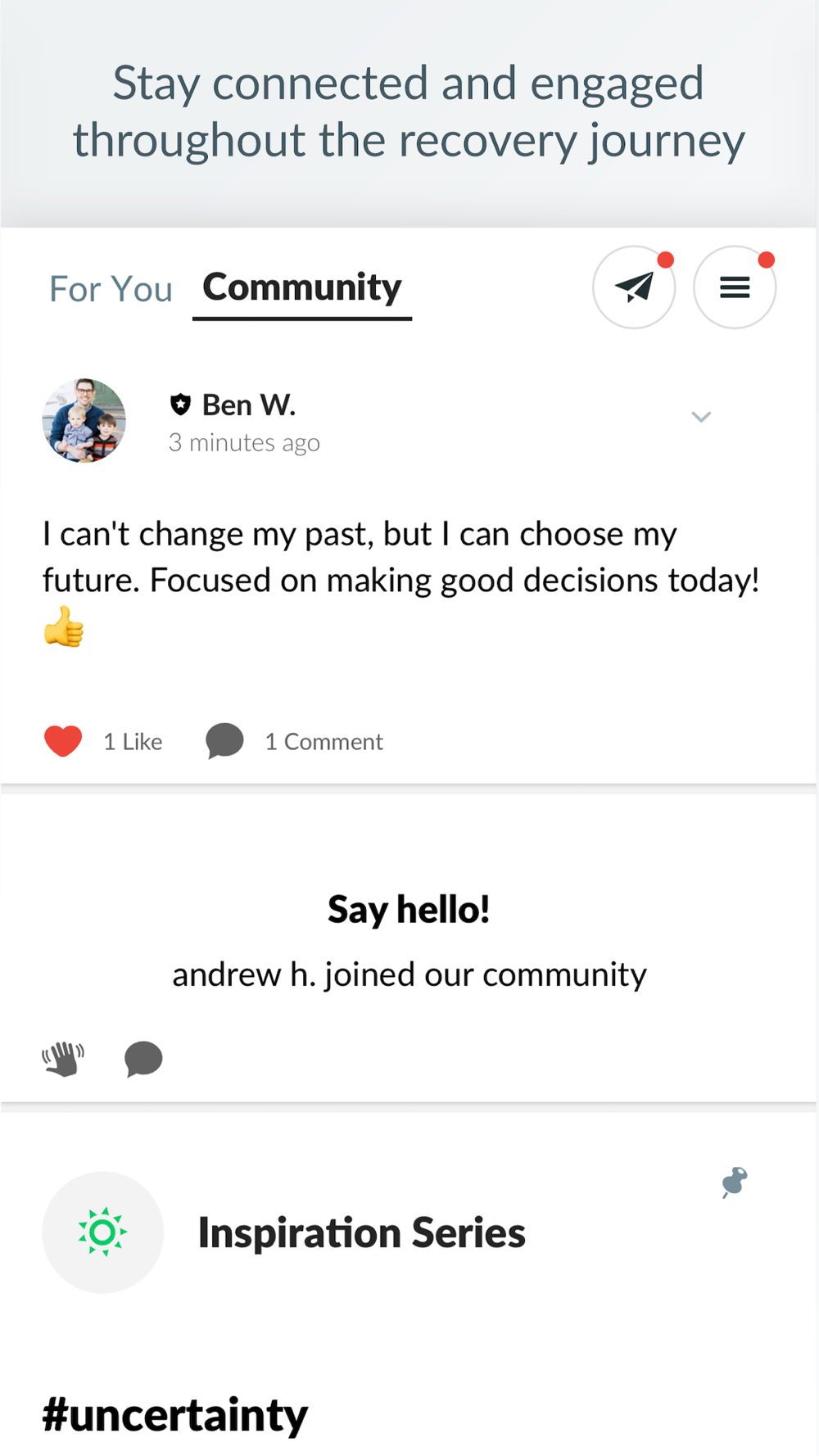 Share updates, ask questions, support others, and stay connected with others throughout your recovery. This community is a tool to help you in recovery and receive support when you need it the most.