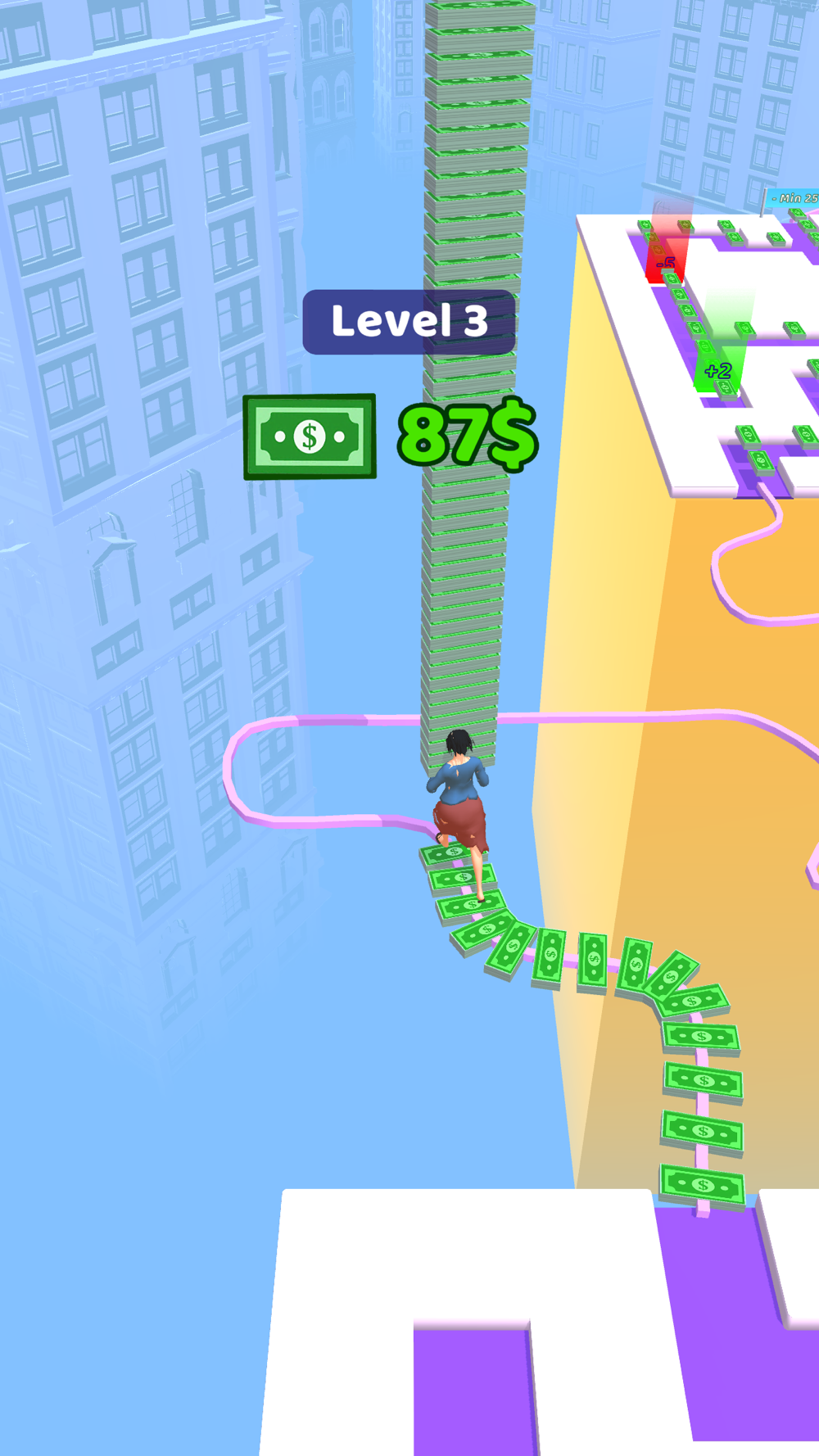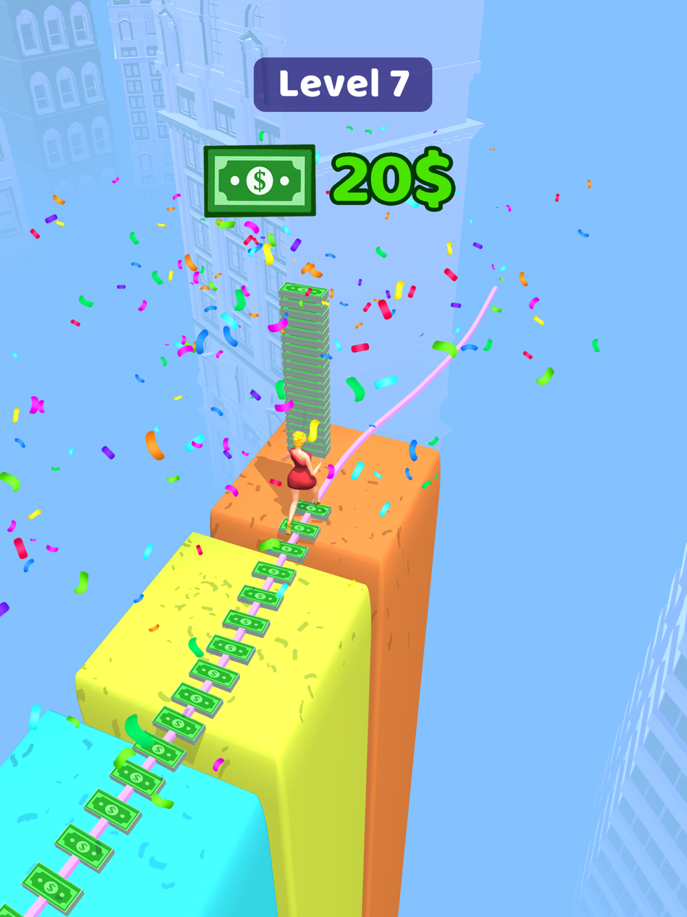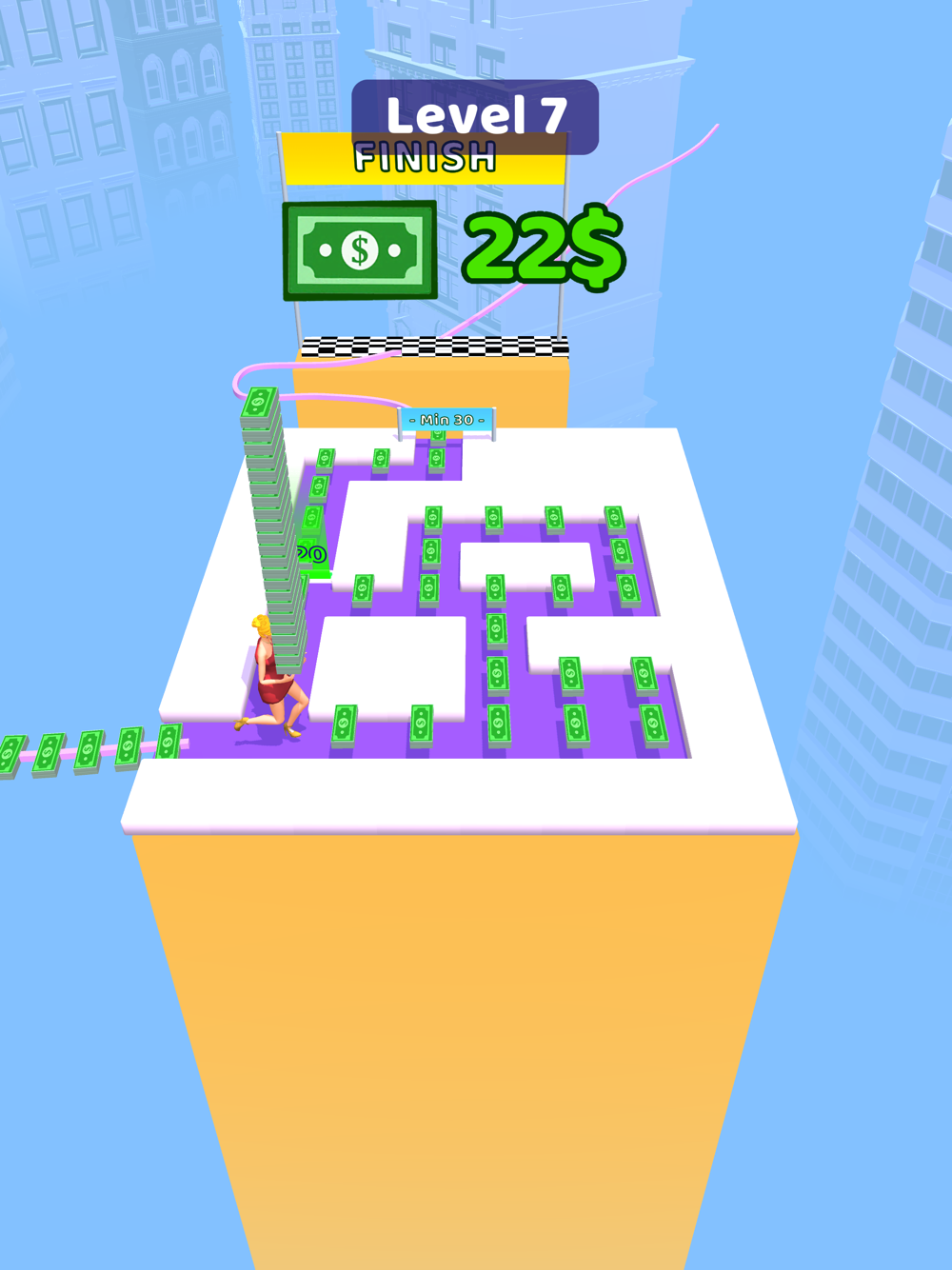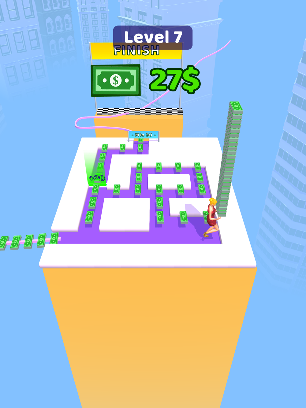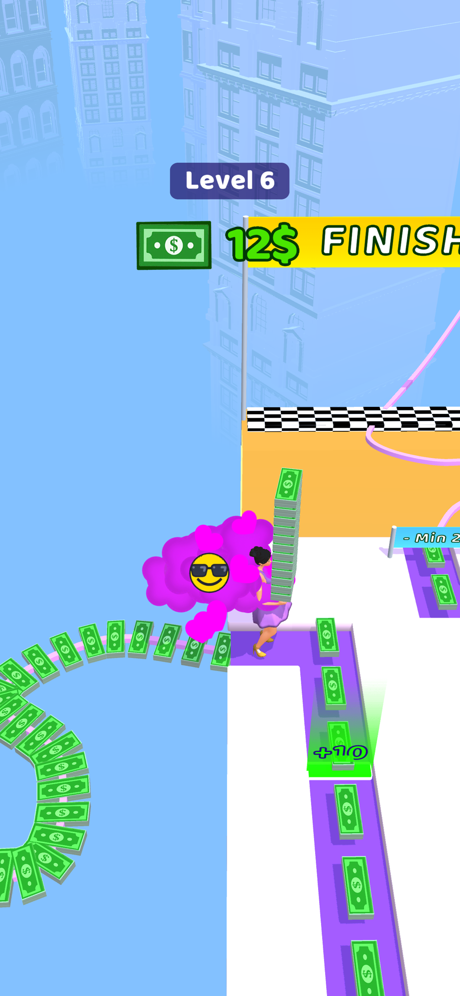 Move your character with swipes left and right. Watch out for doors that will decrease or increase your money. Go through the doors in the right order and collect the most money and move on to the next platform.