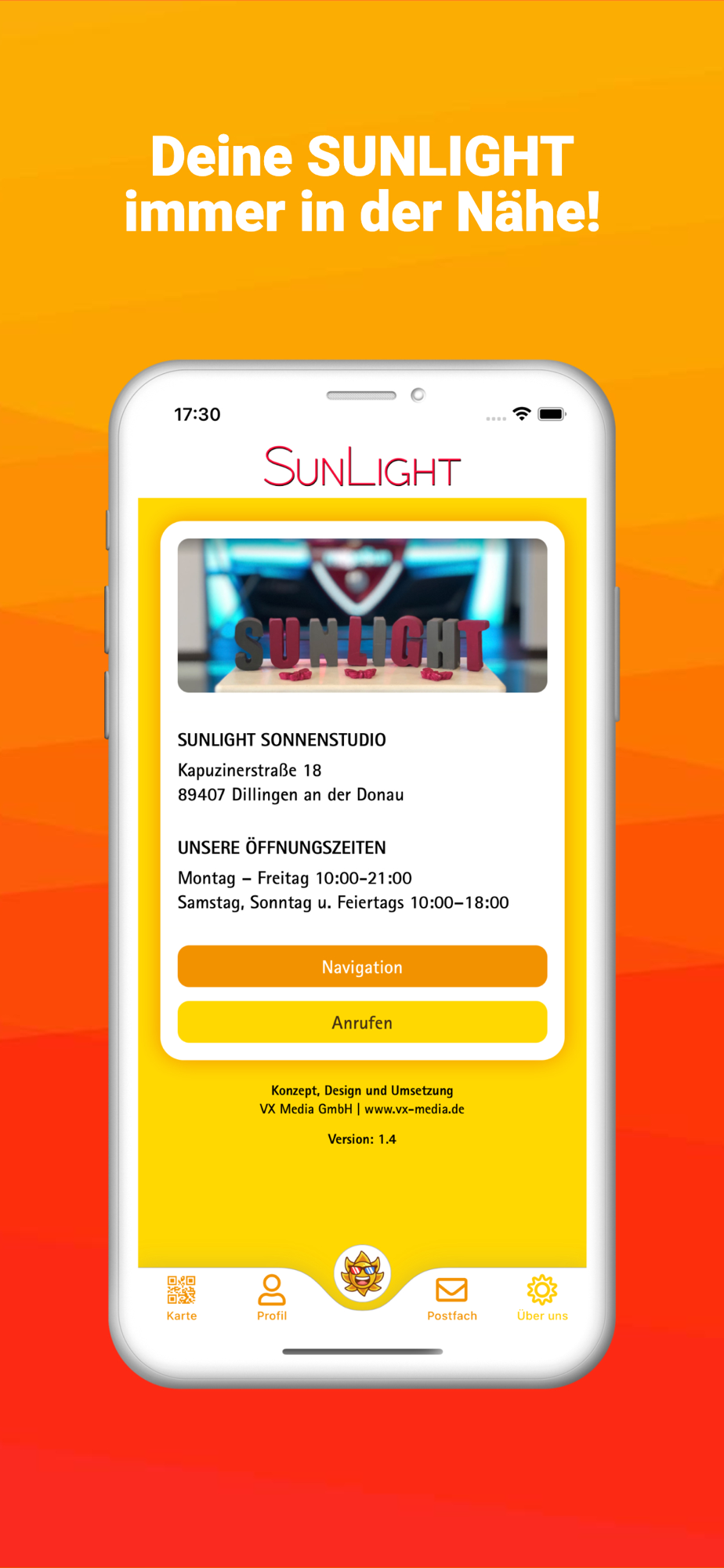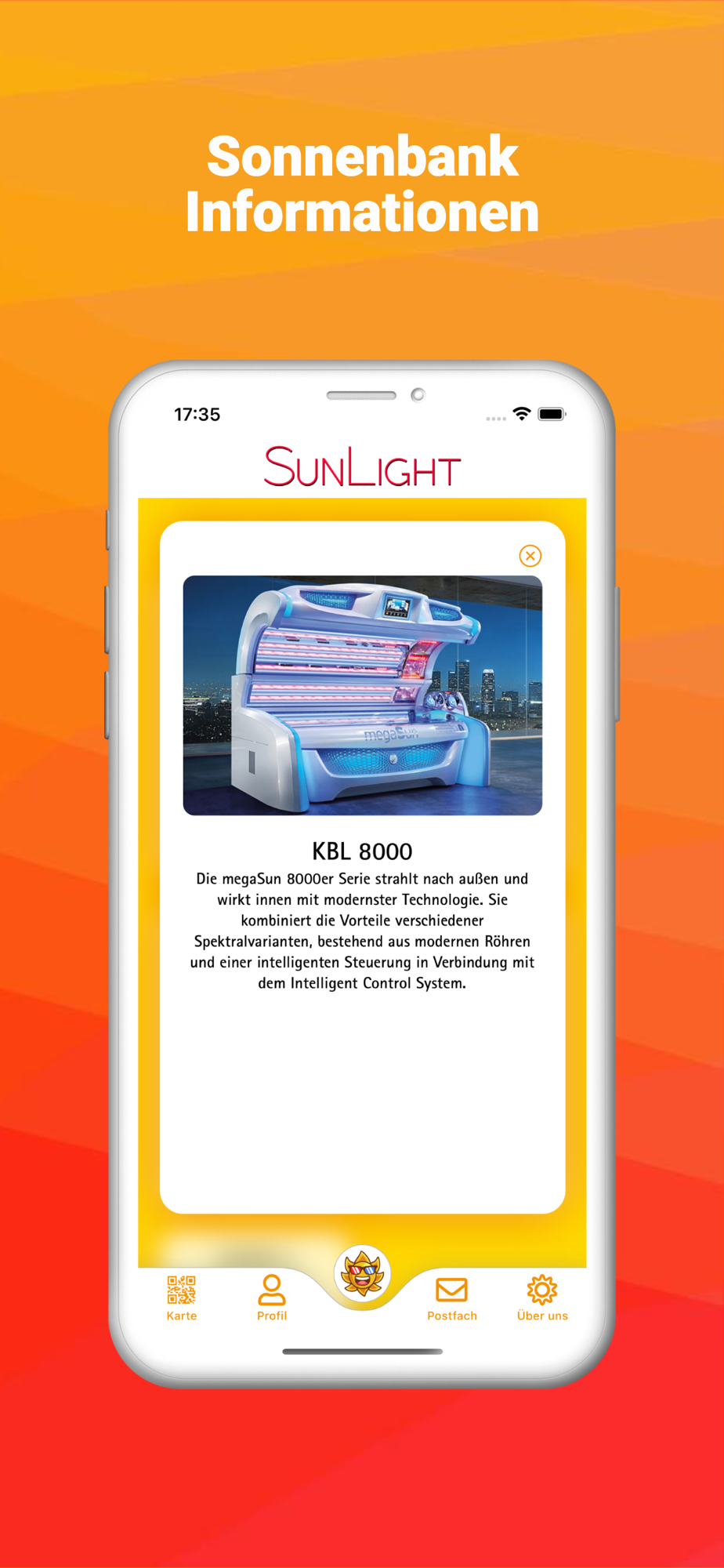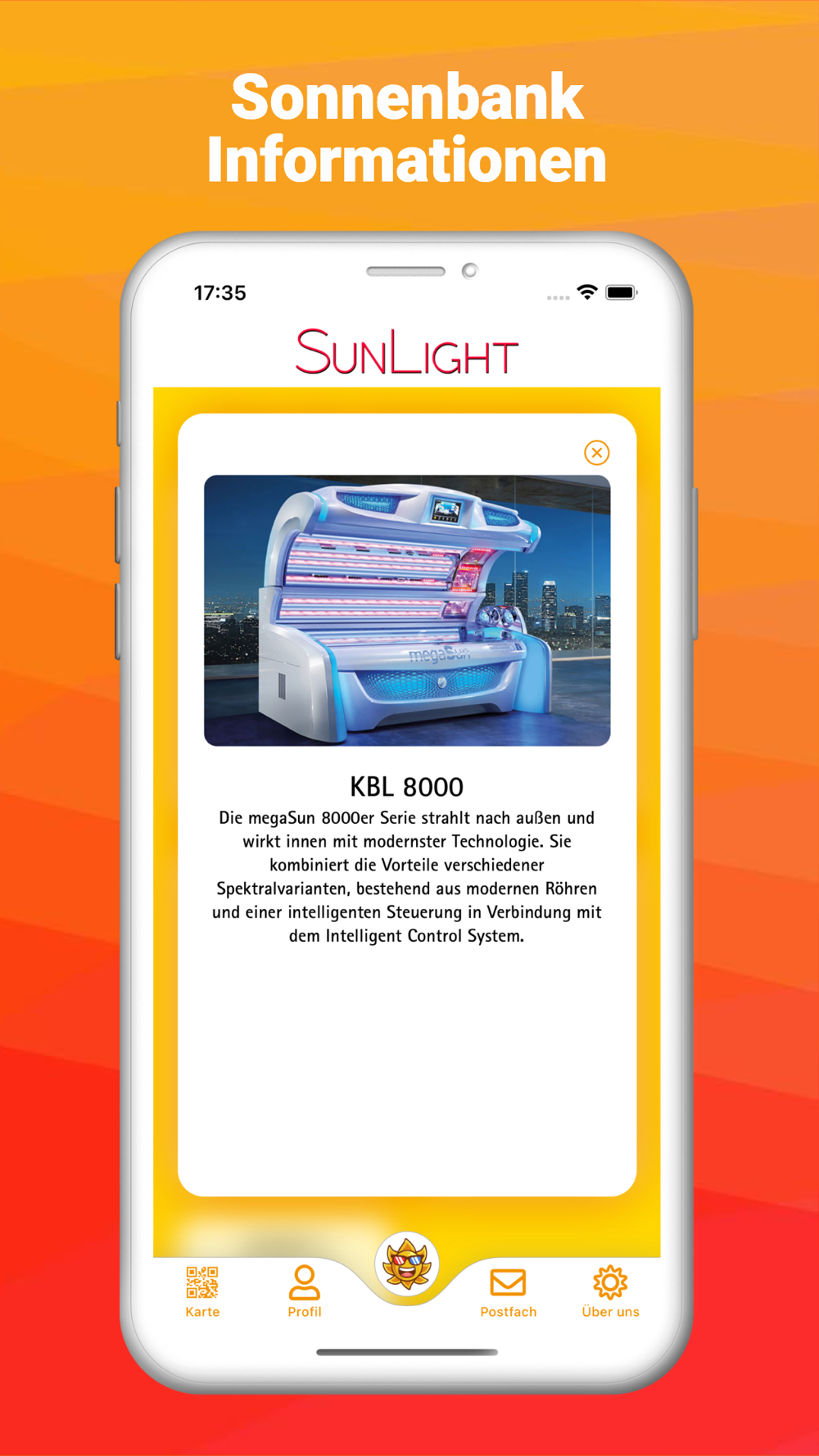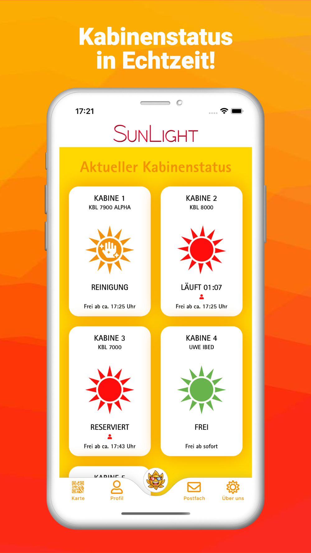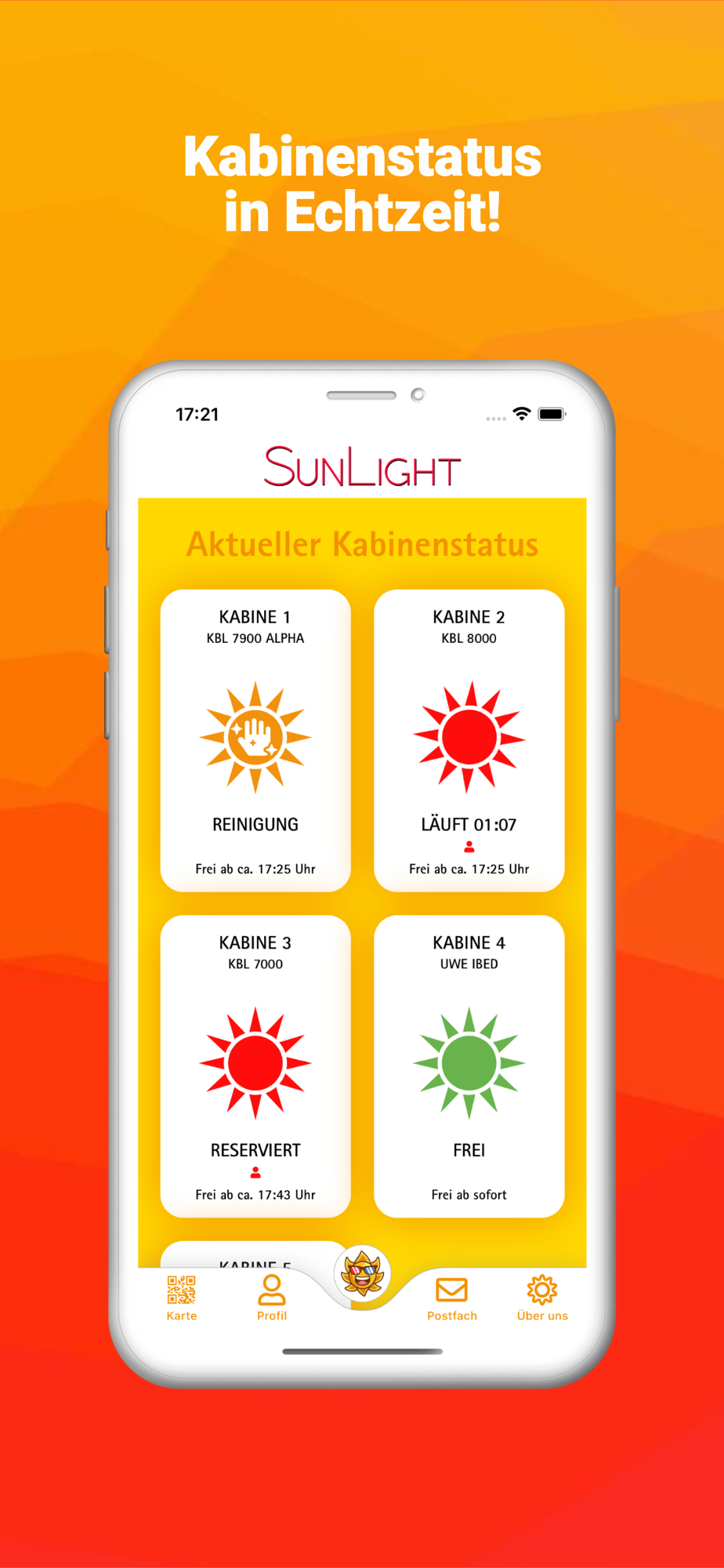 Die App bietet dir neben aktuellen Angeboten, Öffnungszeiten, Aktionen und Informationen, auch den augenblicklichen Kabinenstatus in Echtzeit, von deiner Sunlight. Somit weißt du immer, ob, oder wie lange, deine Lieblings-Sonnenbank noch läuft.