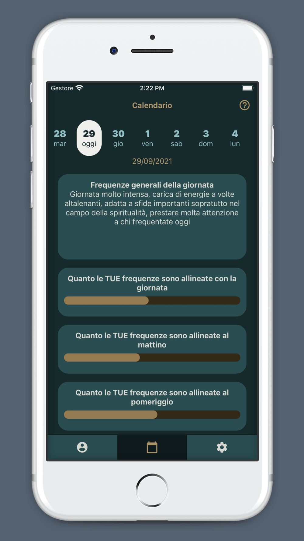 L'app avrà come prima schermata, oltre ai dati dell’utente, un indicatore a “semaforo” e sarà illuminato in base all’accordatura di frequenza determinata dai dati dell’utente (nome, cognome, data di nascita).