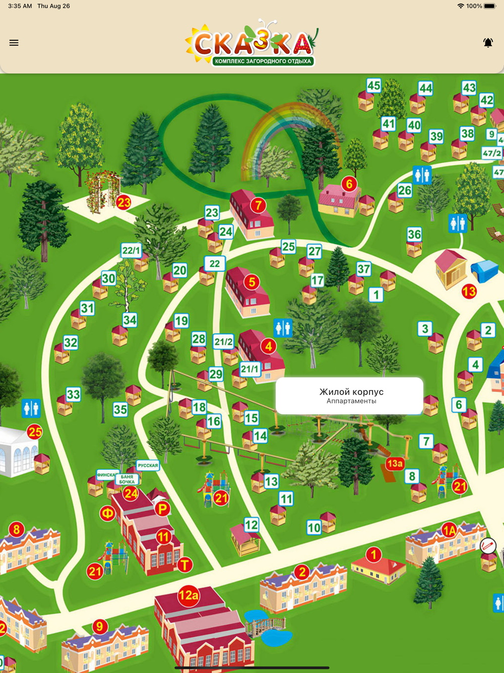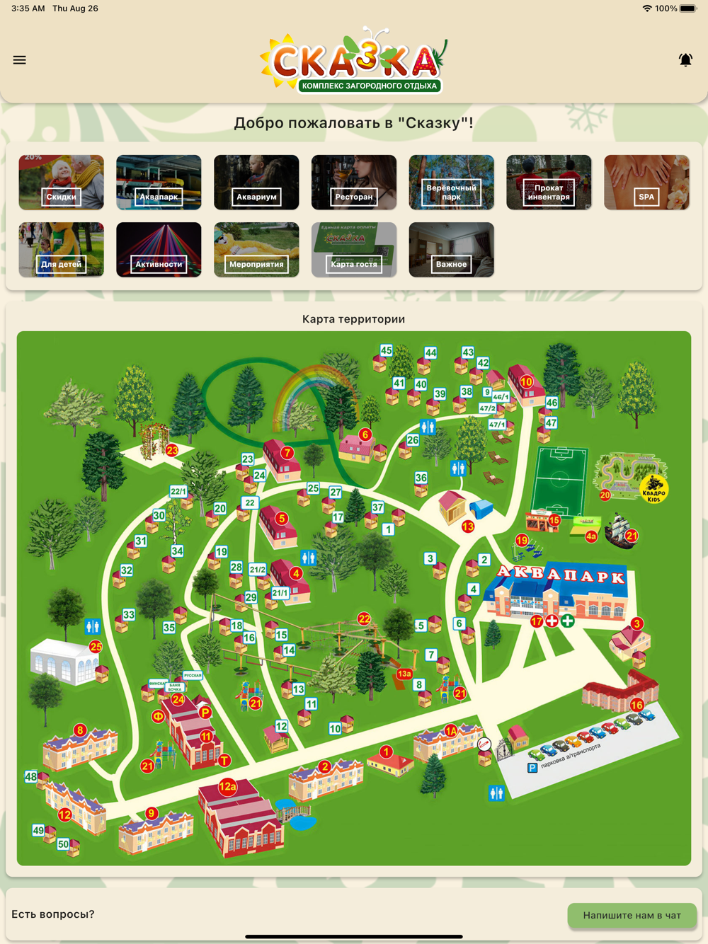 Приложение поможет сориентироваться на территории загородного отеля — найти нужную беседку или услугу, ознакомиться с программой анимации на каждый день и ежегодными мероприятиями, а страница скидок подскажет как сэкономить.