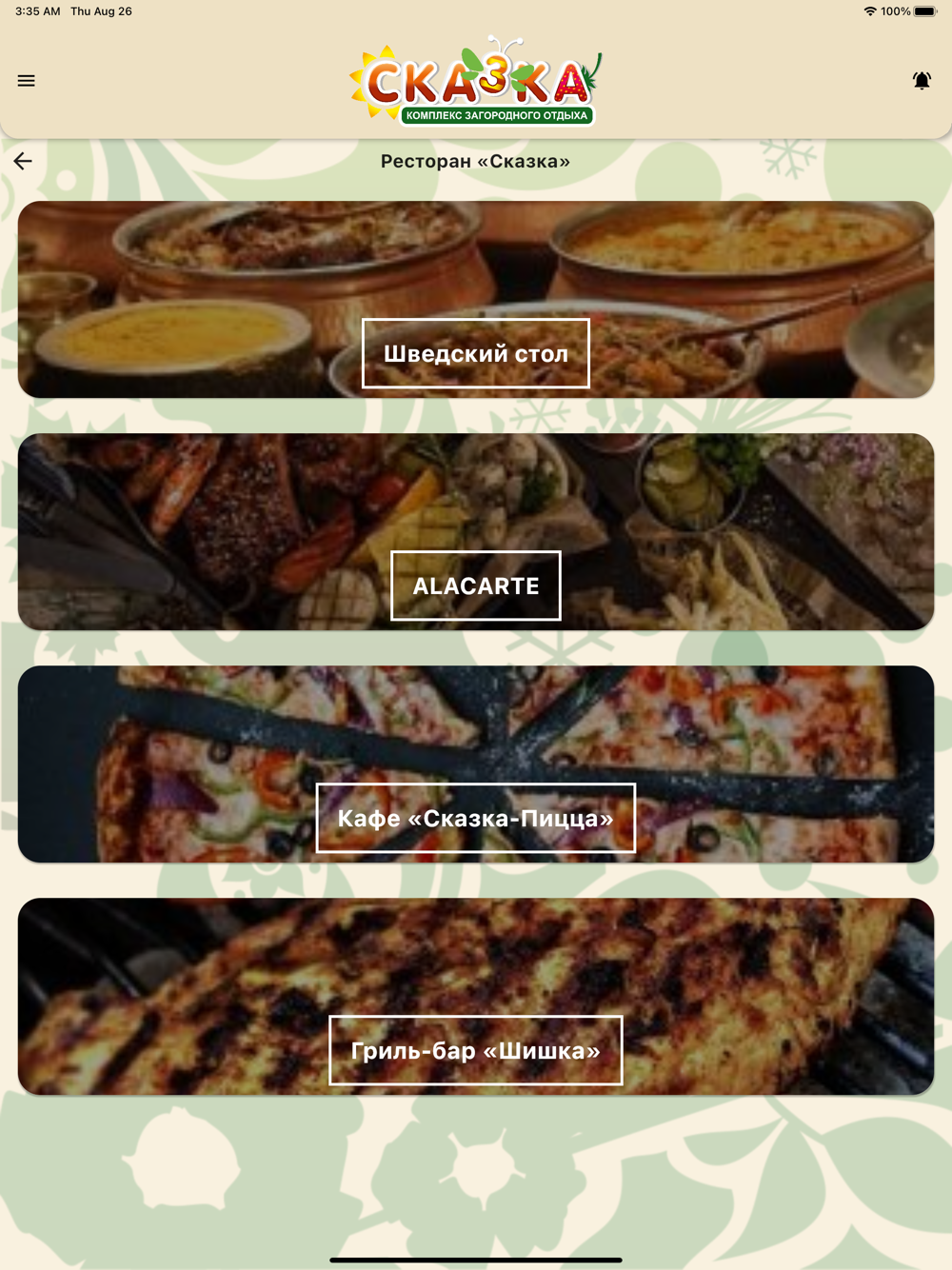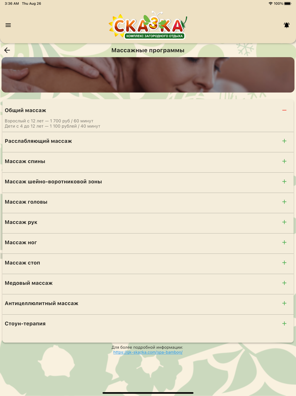 Думаете где перекусить? Тогда загляните во вкладку ресторан или кафе, там выложены меню с актуальными ценами. В разделах услуги можно всегда найти куда сходить и как развлечься, а главное не нужно идти в административный корпус или ждать загрузку сайта, что бы ознакомиться с прайсом на SPA или прокат- теперь вся необходимая информация есть в приложении!