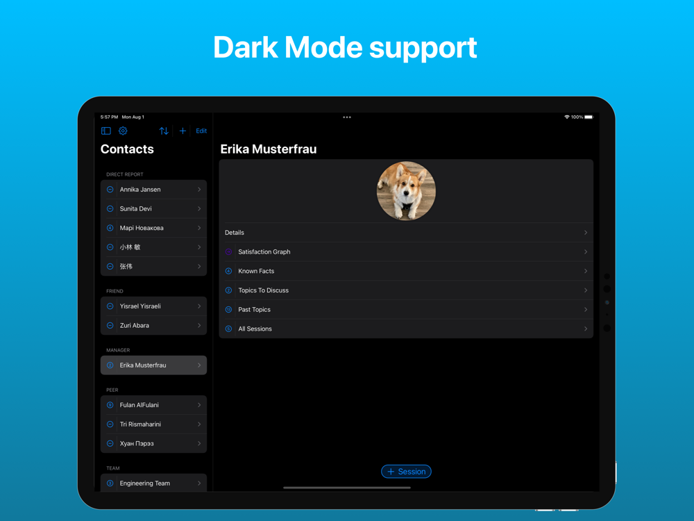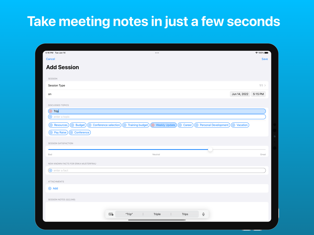 - Add different types of sessions (1:1s, group meetings, get togethers, etc.) and their key details, such as discussed topics, discovered biography facts, mood in minimal number of taps.